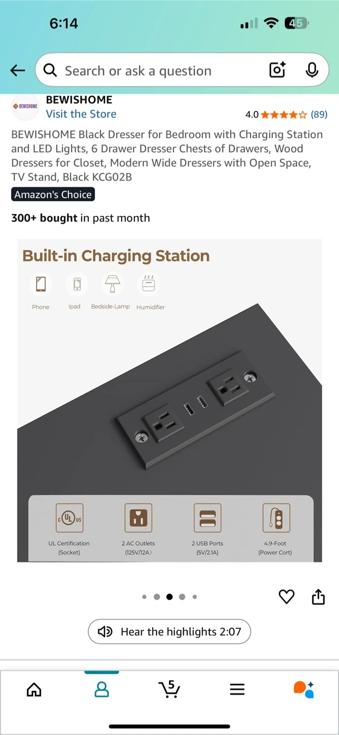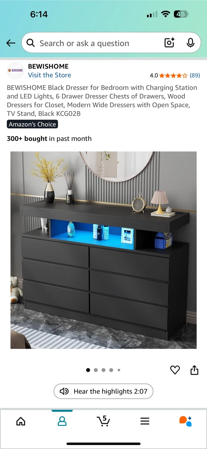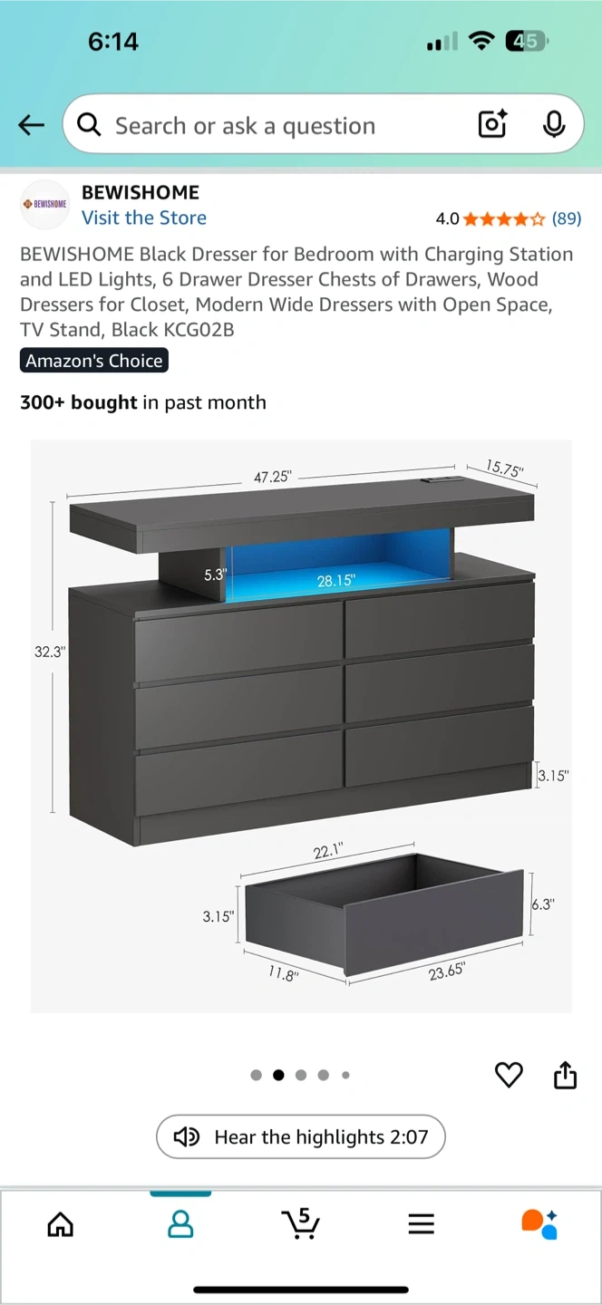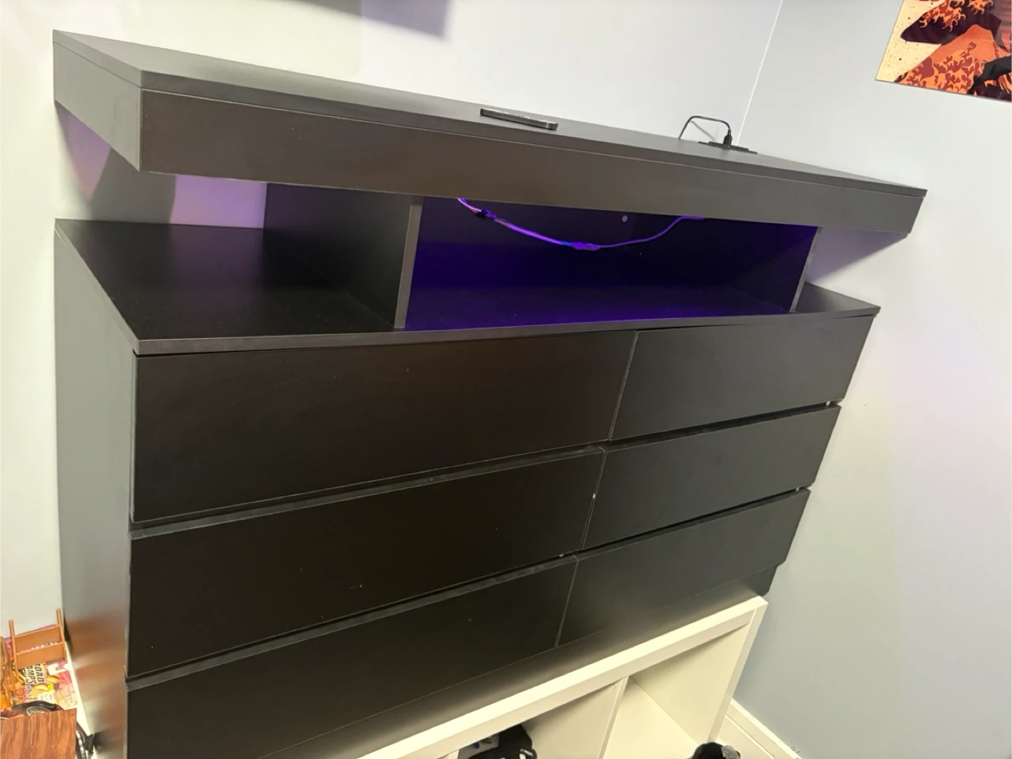 Selling a BEWISHOME black dresser for the bedroom! It has a built-in charging station with 2 AC outlets and 2 USB ports. The dresser features 6 drawers and LED lights. Dimensions are 47.25" x 15.75" x 32.3". It's a modern wide dresser with open space, perfect as a TV stand or for closet organization