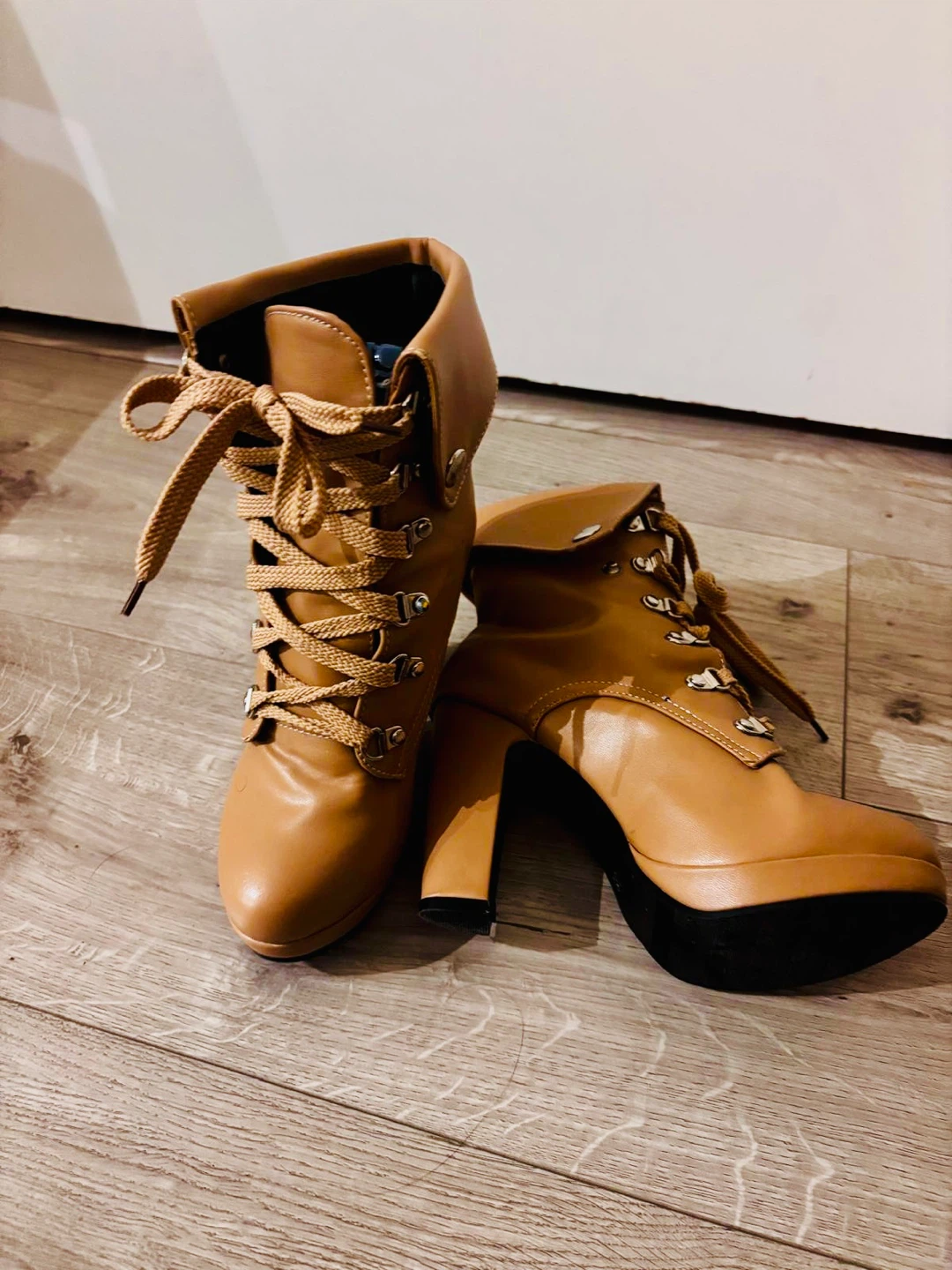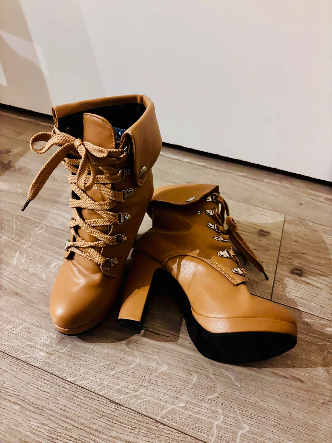 Selling a pair of stylish tan, lace-up heeled ankle boots! They're in great condition and would be a lovely addition to your wardrobe. The size is 8. These boots feature a comfortable heel and a unique lace-up design, perfect for adding a touch of flair to any outfit. Have been worn once for 1 hour and got so many compliments, unfortunately too small for me.
