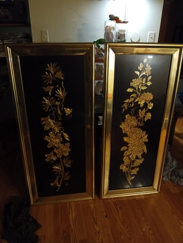 Selling a pair of framed wall art pieces! They feature a black background with gold floral designs and gold frames. They would look great in any room! 4 ft 53in with glass π― each or best offer