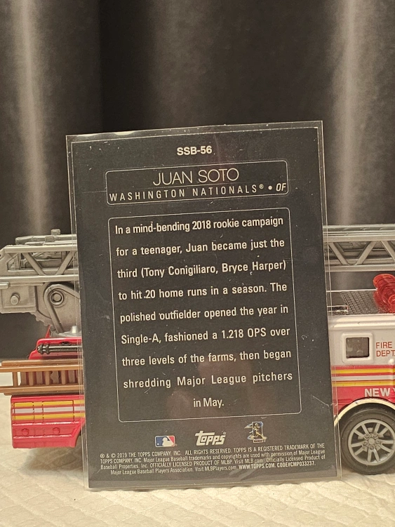 Selling a Topps Juan Soto baseball card, Washington Nationals. The card is from the Stars of the Game series. It highlights his impressive 2018 rookie campaign where he became the third teenager to hit .20 home runs in a season