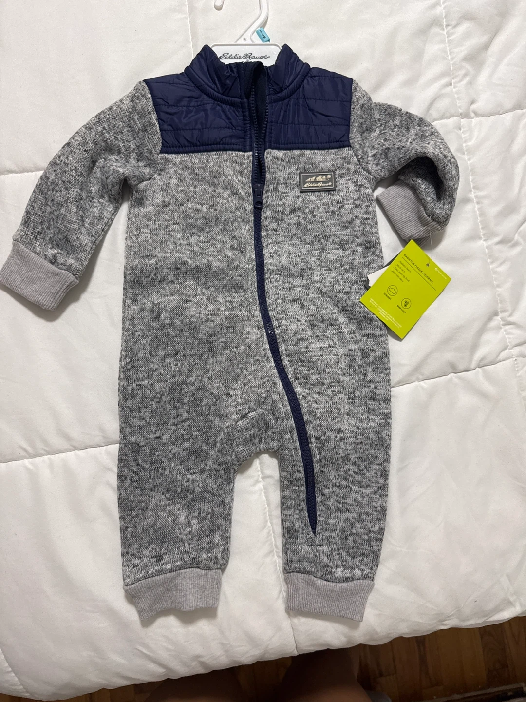 This Eddie Bauer infant fleece coverall is brand new with tags! It's a heather gray color with a navy blue quilted upper chest area. Perfect for keeping your little one warm and cozy during cooler weather