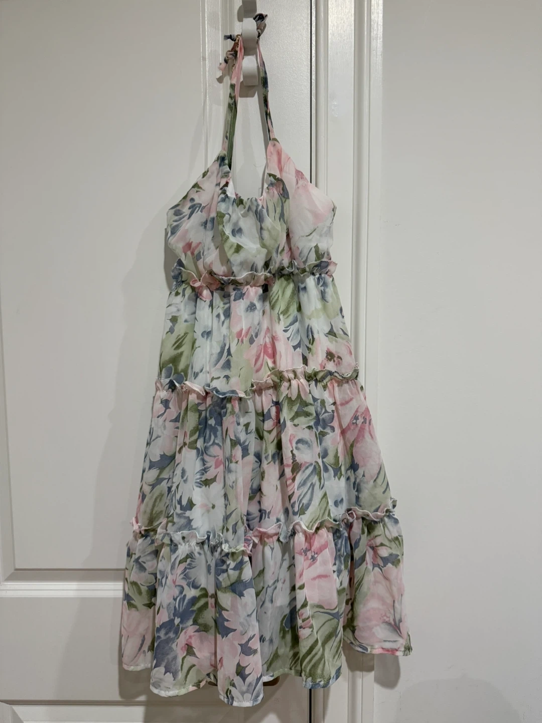 This dress features a beautiful floral print and a fun, flirty ruffle tiered design. It's perfect for a casual day out or a summer party. The dress is lightweight and comfortable, making it ideal for warm weather. The straps are spaghetti and needs to be tied up therefore adjustable.