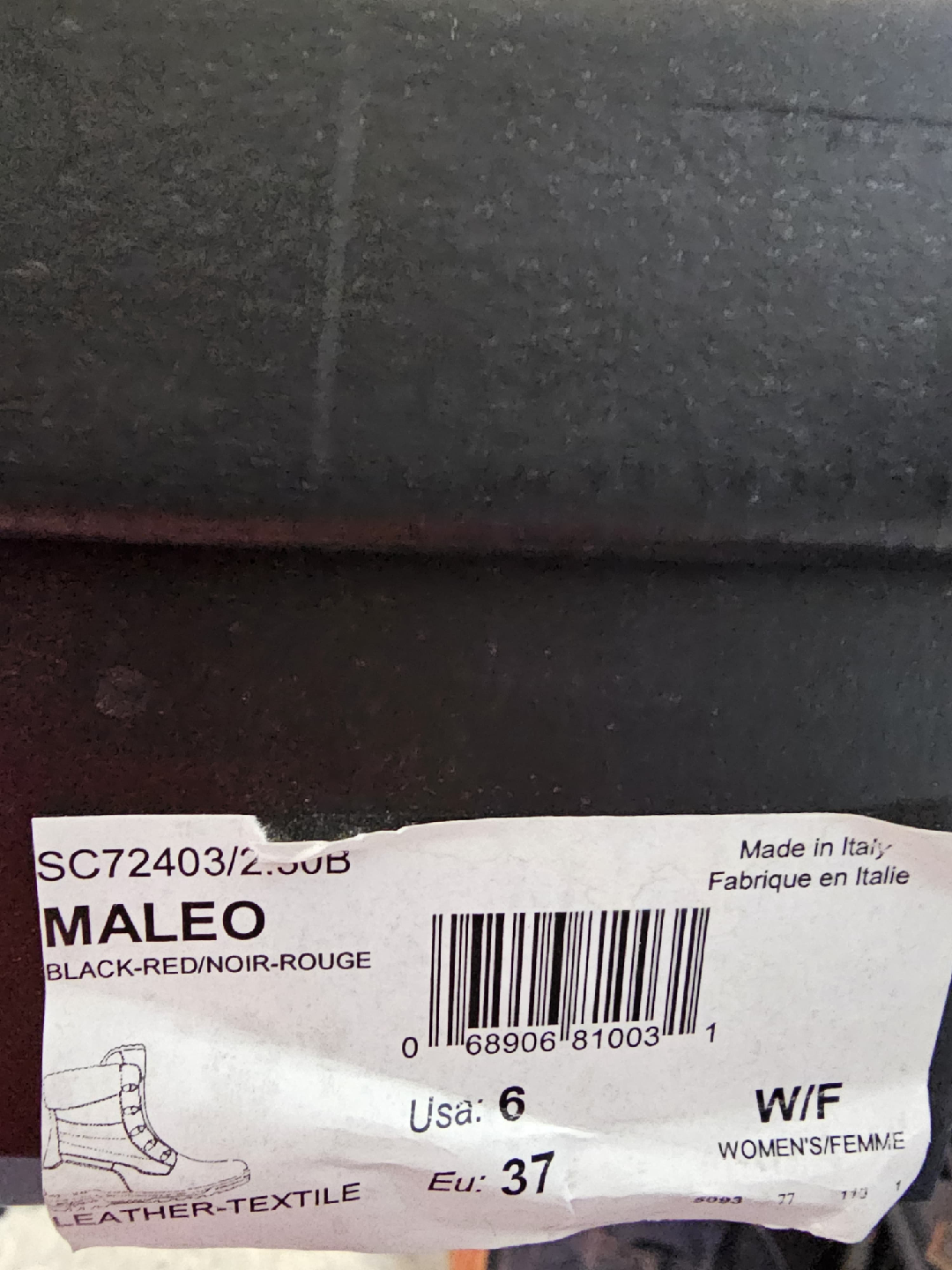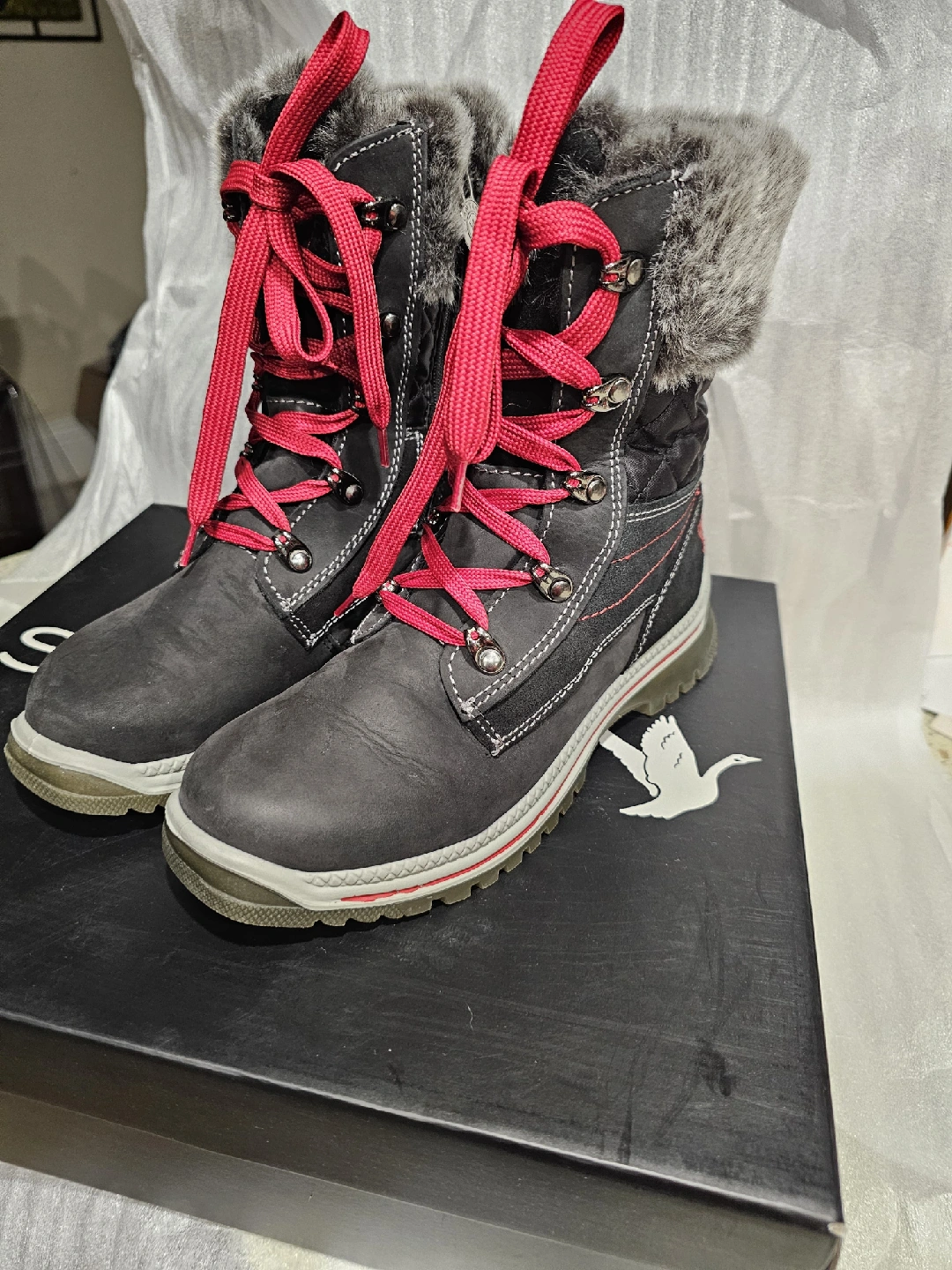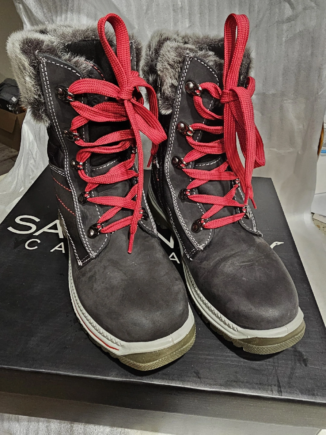 Santana Canada Maleo women's winter boots in black and red, size 6 US. They have a leather-textile construction and come in the original box