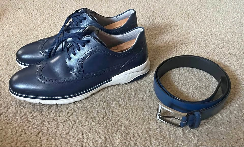 Florsheim Wing Tip Shoes, Navy, Size 10.5 + Belt