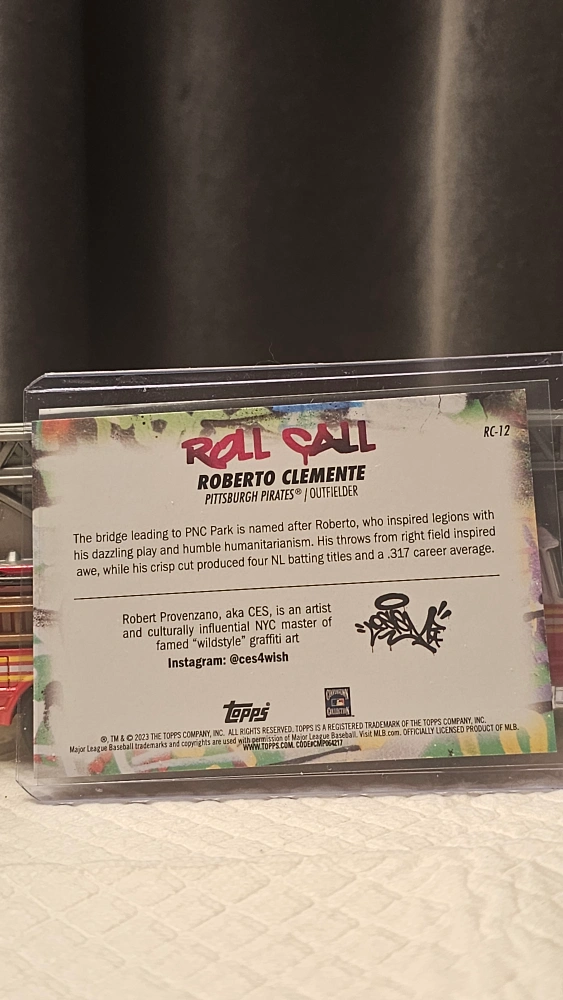 Selling a Roberto Clemente baseball card from Topps. It's a Roll Call card featuring the Pittsburgh Pirates outfielder. The back of the card highlights Clemente's achievements and his impact both on and off the field