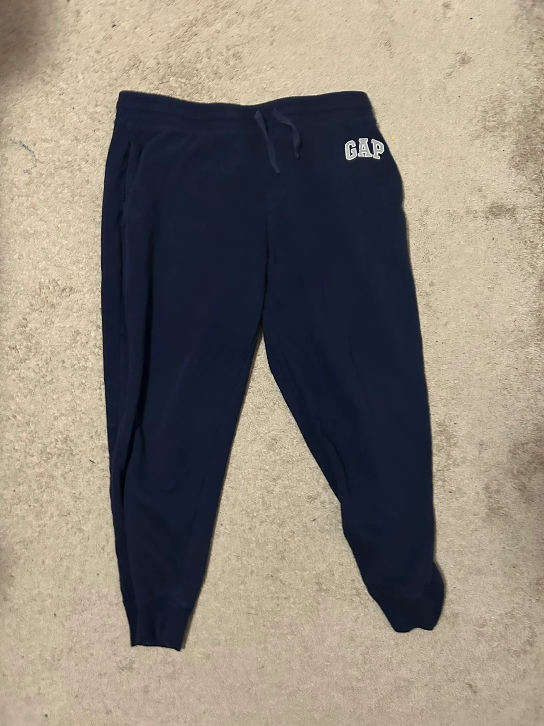 Selling a pair of GAP sweatpants in navy blue. They're in great shape and super comfy for lounging around the house or running errands! The GAP logo is on the upper left leg.