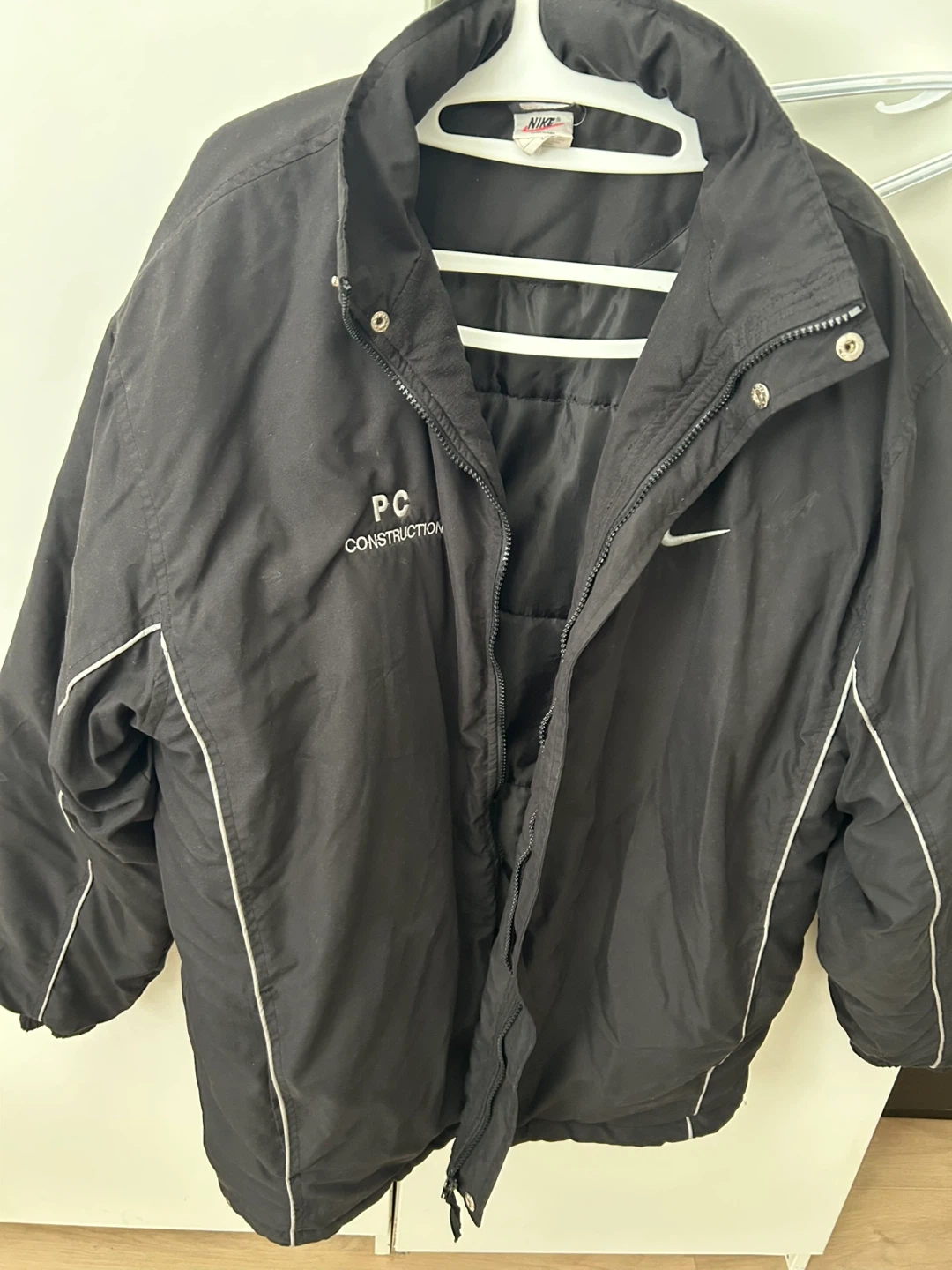 Selling a black Nike jacket in size L/G. It's in great condition and ready for a new home! The jacket features the Nike swoosh logo and a zipper closure. Perfect for layering or wearing on its own
