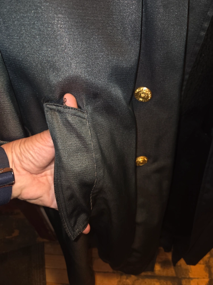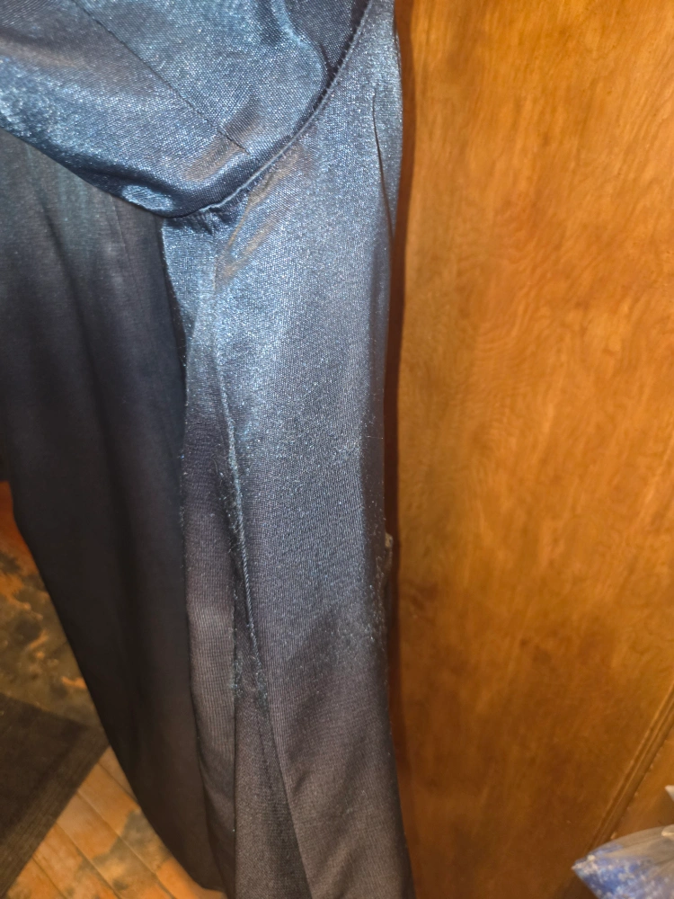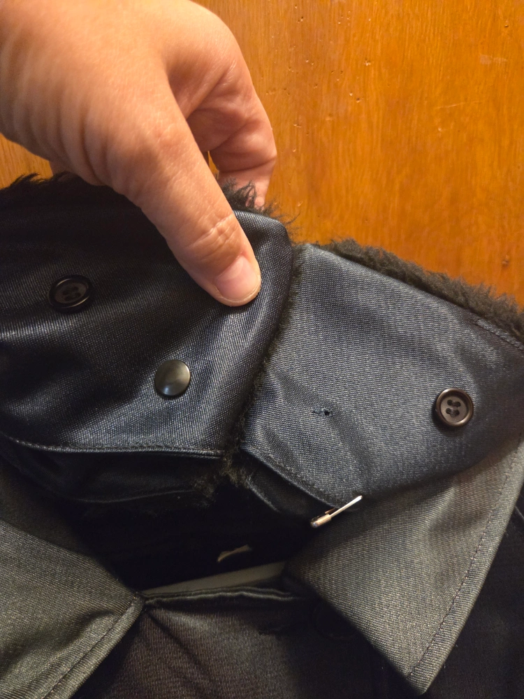 There is some minor damages(see photos). Such as the outer right pocket stitching has come undone from use & some Very tiny snags under right arm area, 1 collar snap broken (I'll probablystep on in the middle of the night 🙄) . All pockets are intacted.
