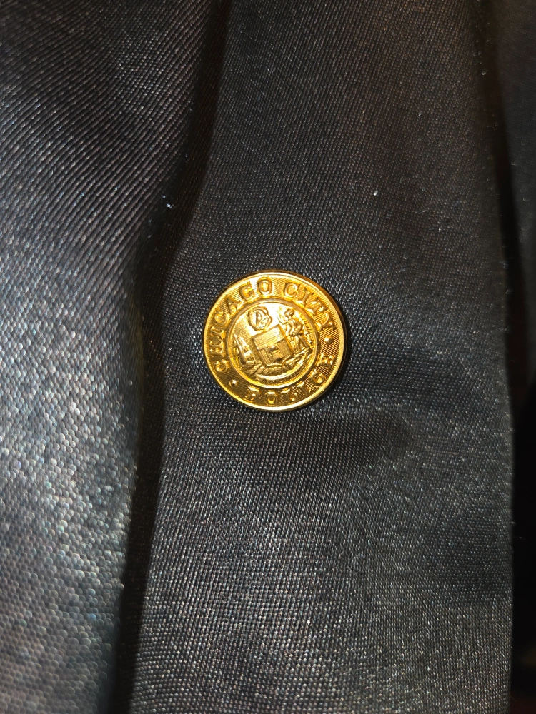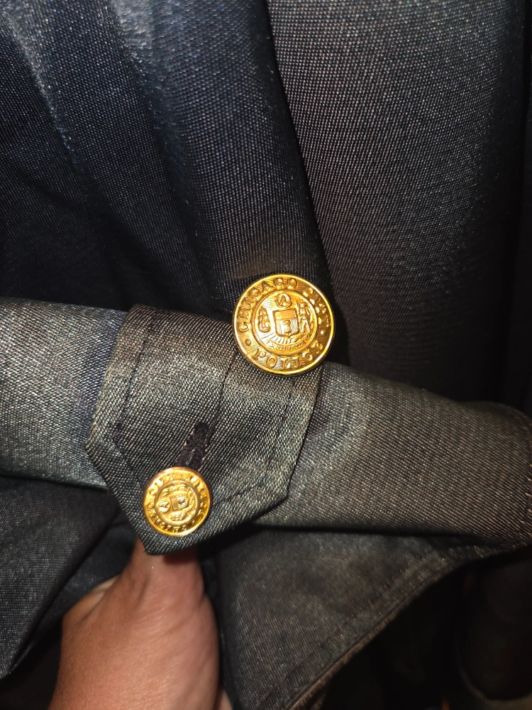 It features the Chicago Police Crossing Guard patch on the upper left arm. Double breasted front closure of gold "Chicago City Police" buttons & same style but smaller buttons on cuffs.
