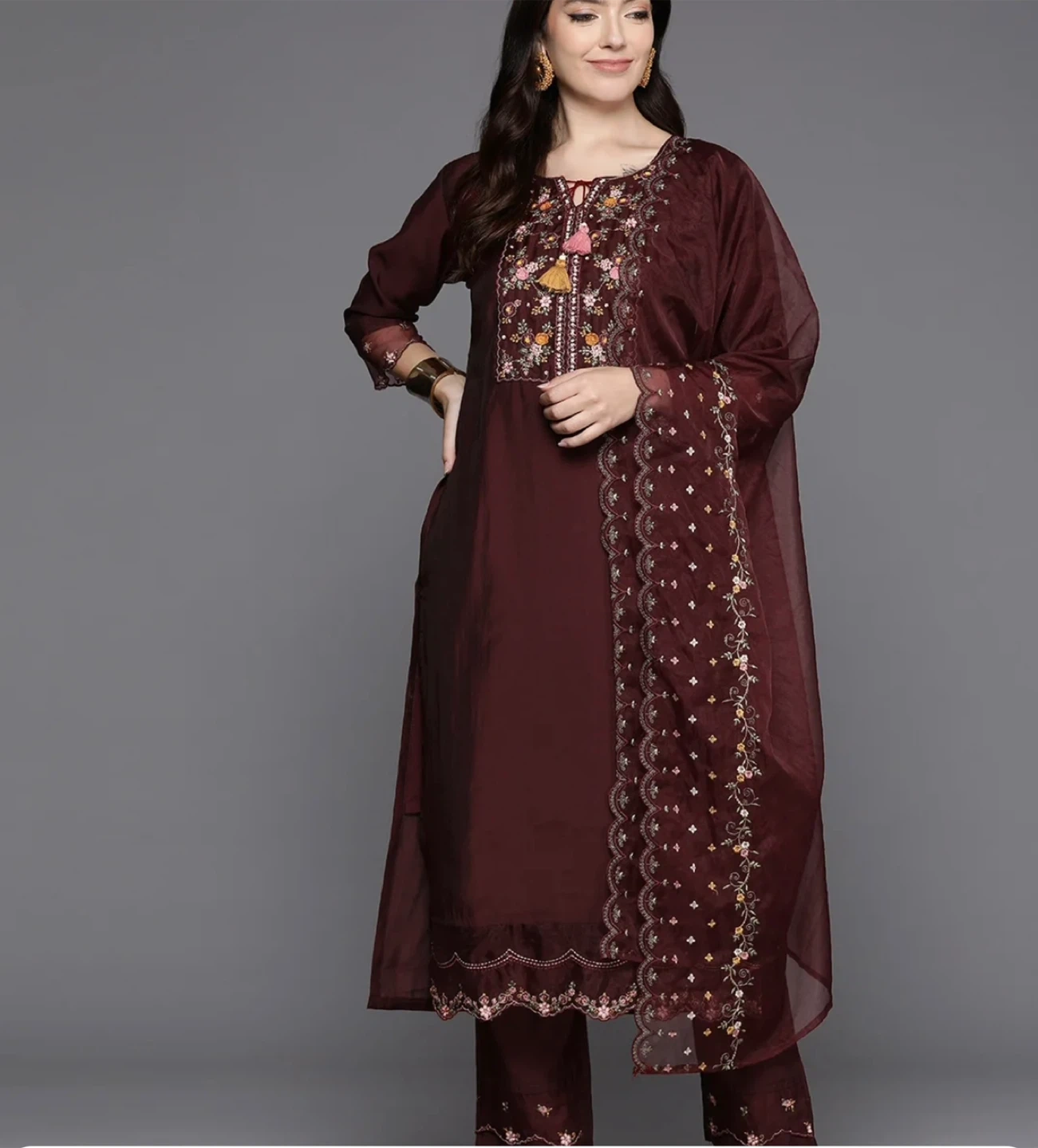 This is a beautiful burgundy kurta set with intricate embroidery. It includes a kurta, pants, and a dupatta. The fabric has a lovely sheen and the embroidery adds a touch of elegance. Perfect for a special occasion or just to feel a bit fancy!