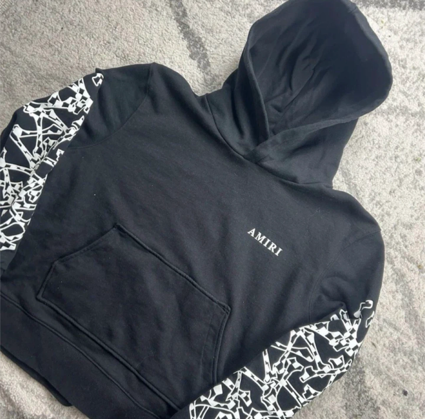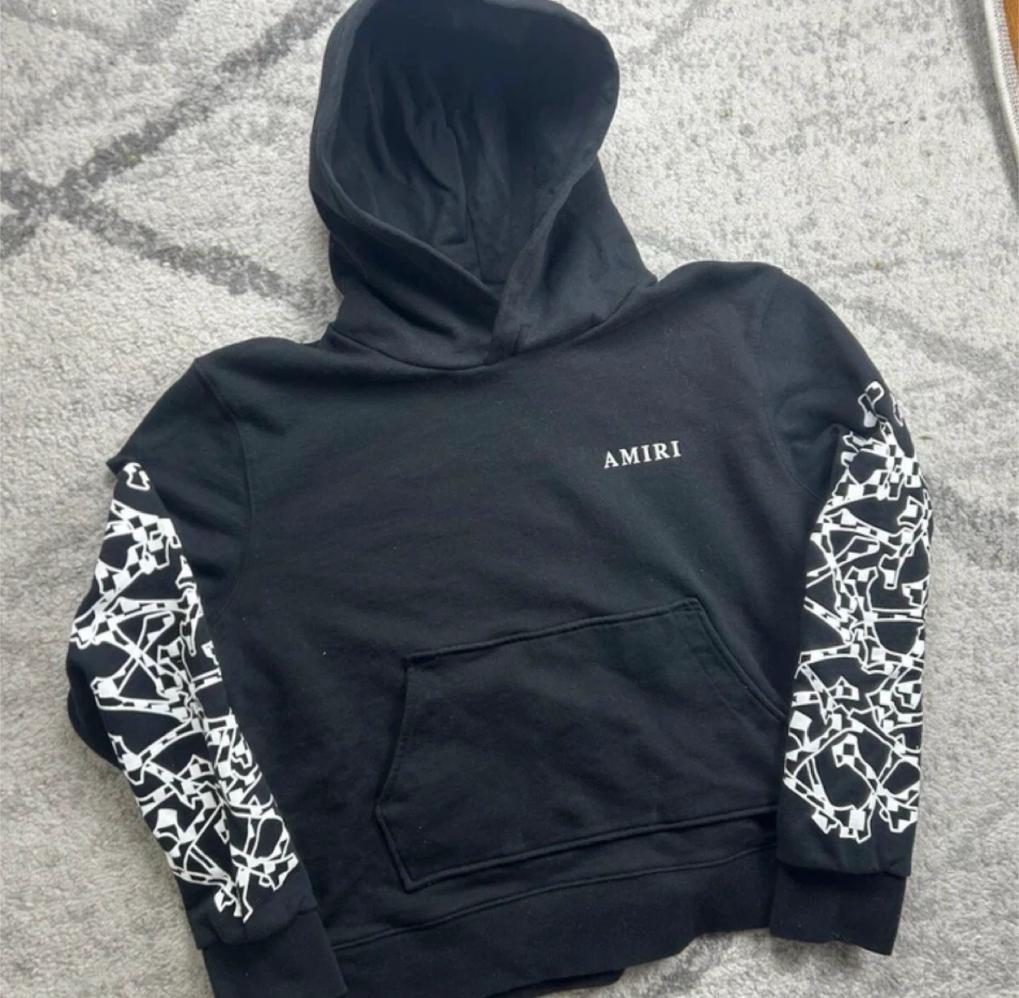 Selling a black AMIRI hoodie. It has a cool design on the sleeves. Great for casual wear! BRAND NEW (If you need another size lmk. that can be arranged) IF INTERESTED PLEASE DM ME BEFORE BUYING I CAN ONLY SHIP IN THE MOMENT ✨HMU FOR ANY OTHER MODEL/COLOR ✨ (Have a lot of clothing in stock. Check out my website if interested)
