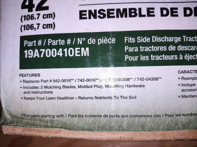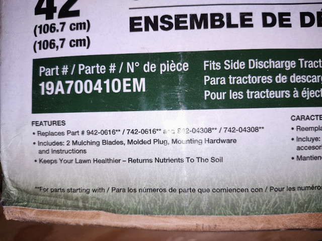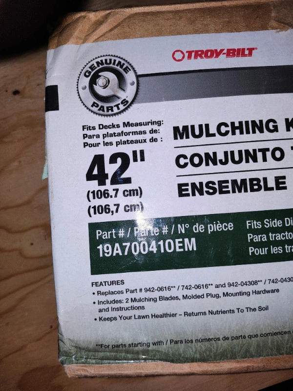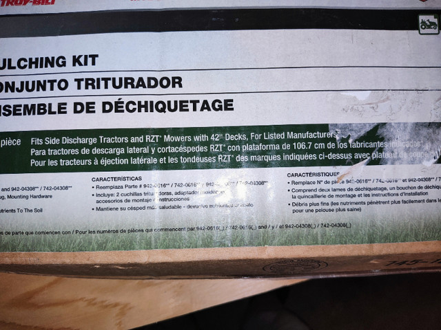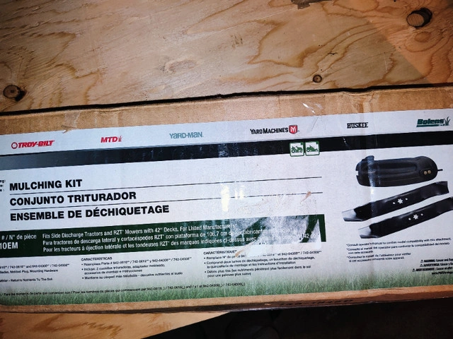 Brand new mulching kit for a riding lawnmower, still in the box. This kit is compatible with TROY-BILT, MTD, YARD-MAN, YARD MACHINE, HUSKEY AND BOLENS riding lawnmowers. All the information is in the photos provided. Asking $70. Thank you