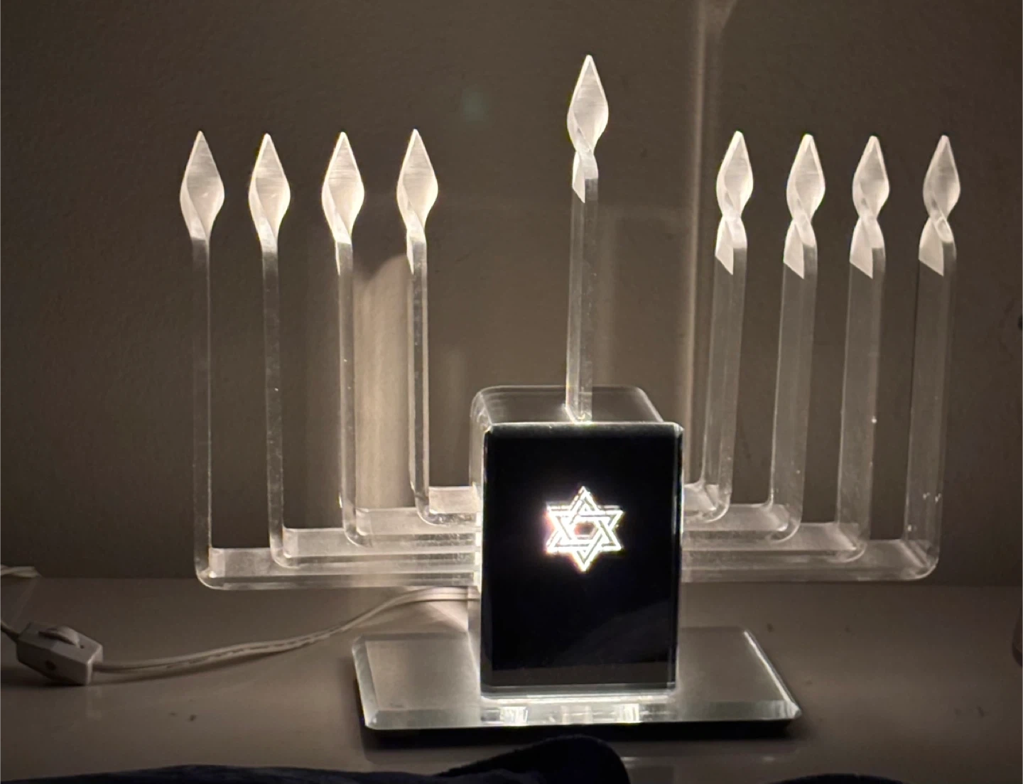 This Menorah is so unique with very unusual features. The Menorah features a plug in cord with an on/off switch on the cord. The front of the piece is mirrored with a star of David and base. The star lights up when the Menorah is on. The back of the piece features 2 turn buttons which allows the candles to be lite one at a time for the holiday or all 8 at once. It's such a beautiful and elegant piece.