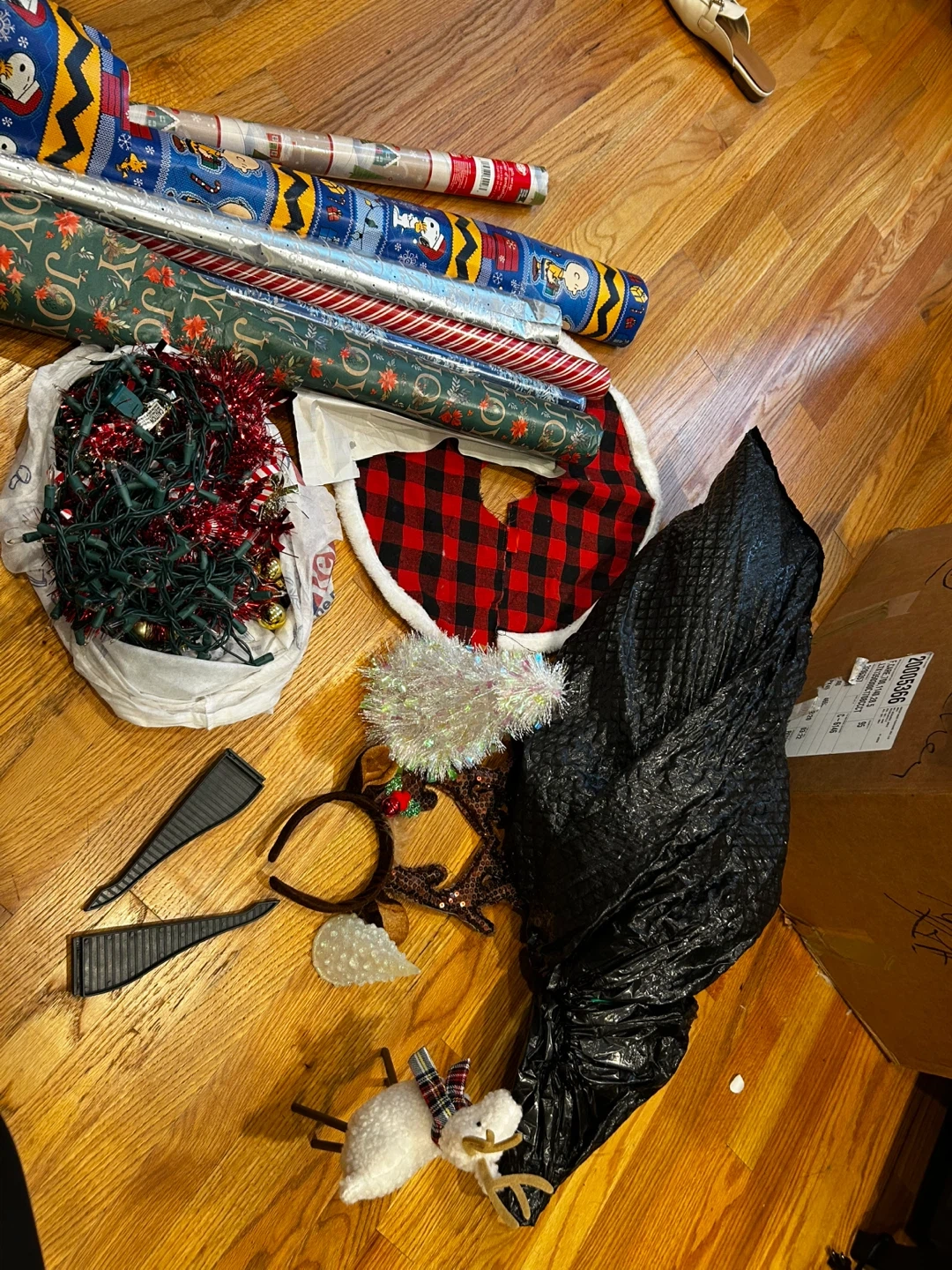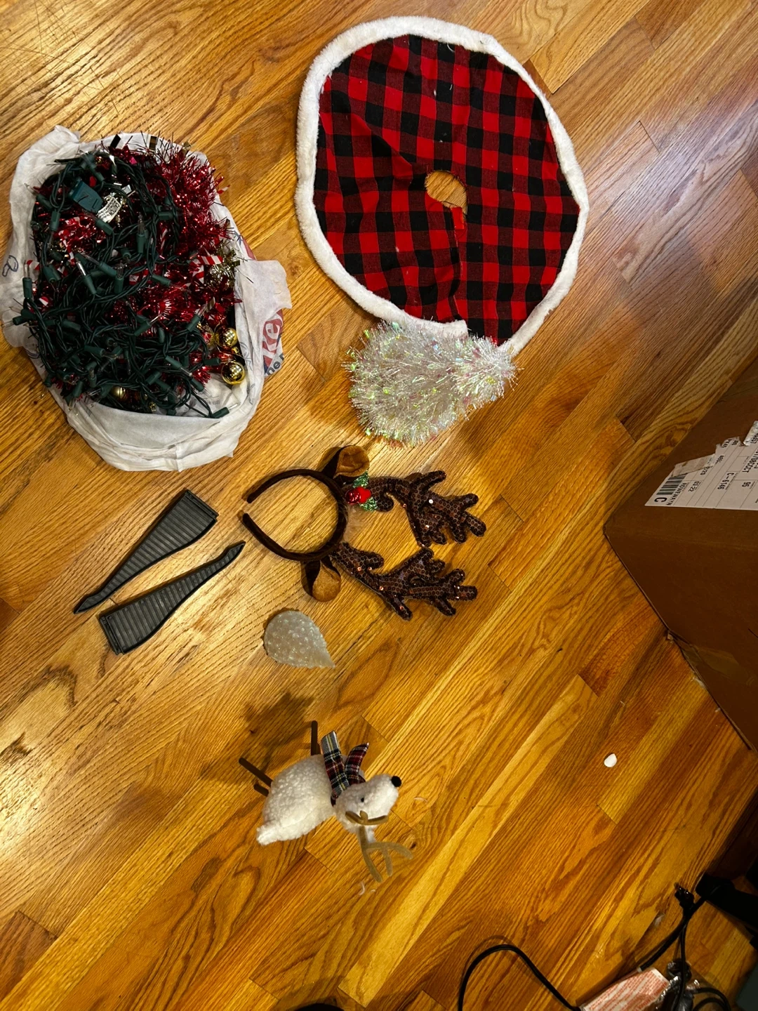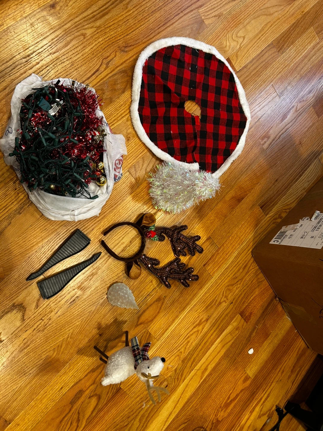 Selling a bundle of Christmas decorations! Includes lights, tree skirt, wrapping paper, reindeer headband, and a stuffed reindeer. Perfect for getting ready for the holidays