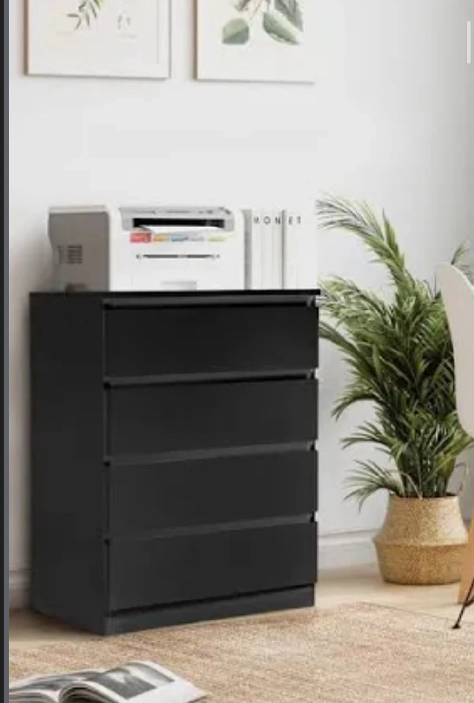 Here's a sleek black dresser with four drawers. It's perfect for adding storage to any room and has a modern look that fits well with various decor styles