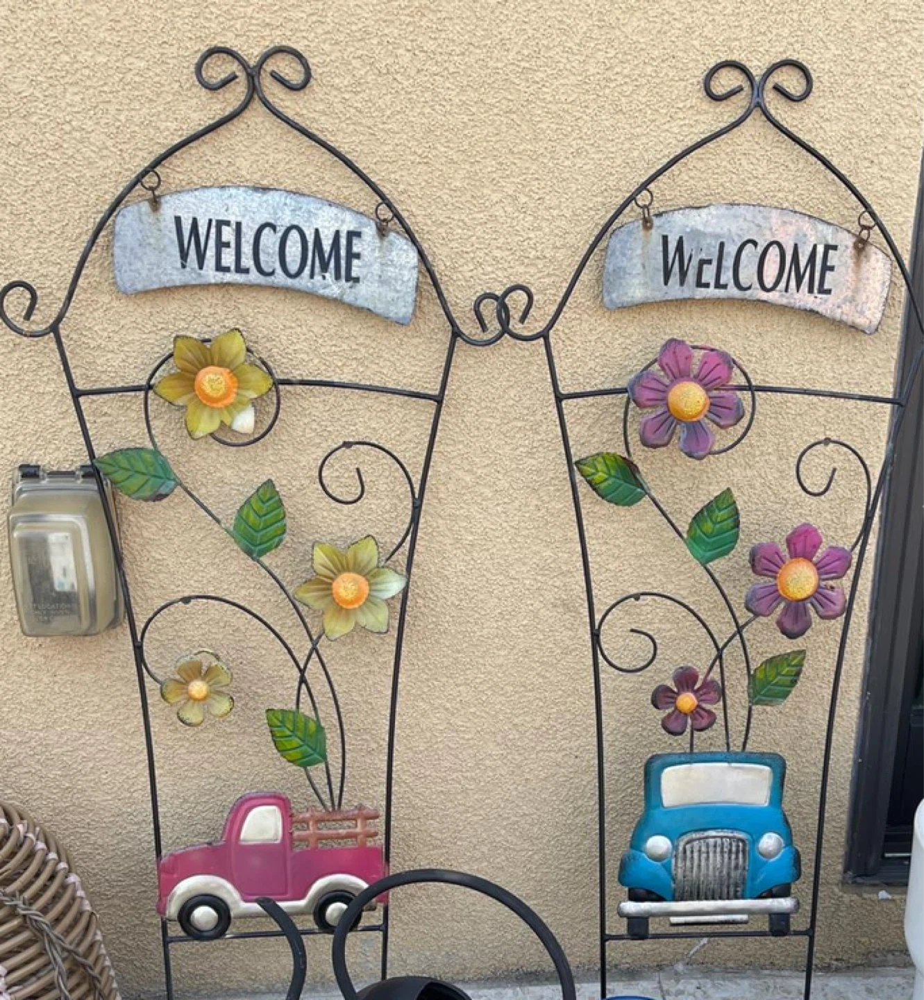 14Cute metal art welcome signs with flowers and trucks! One is pink and one is blue, perfect for adding a touch of charm to your garden or entryway