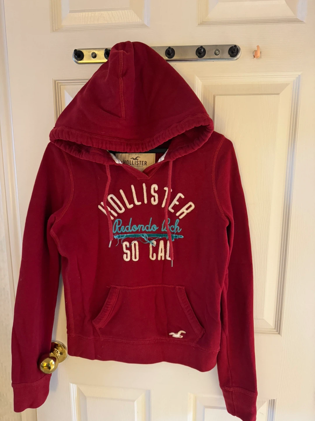 A cozy Hollister hoodie in a lovely red colour! It features the "Redondo Bch SO CAL" design across the chest and a kangaroo pocket in the front. Perfect for staying warm and stylish on cooler days