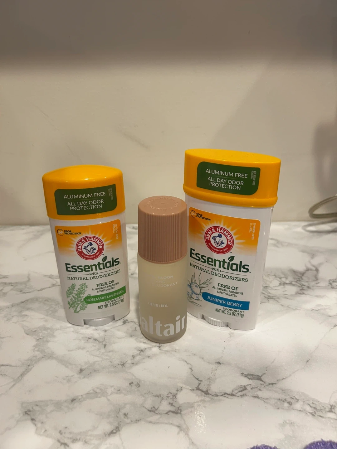 Selling a lot of deodorants! Includes two Arm & Hammer Essentials (Rosemary Lavender and Juniper Berry) and one Altair Bloom deodorant. Each Arm & Hammer deodorant is 2.5 oz (71g) and the Altair deodorant is 1.7 fl oz / 50 mL