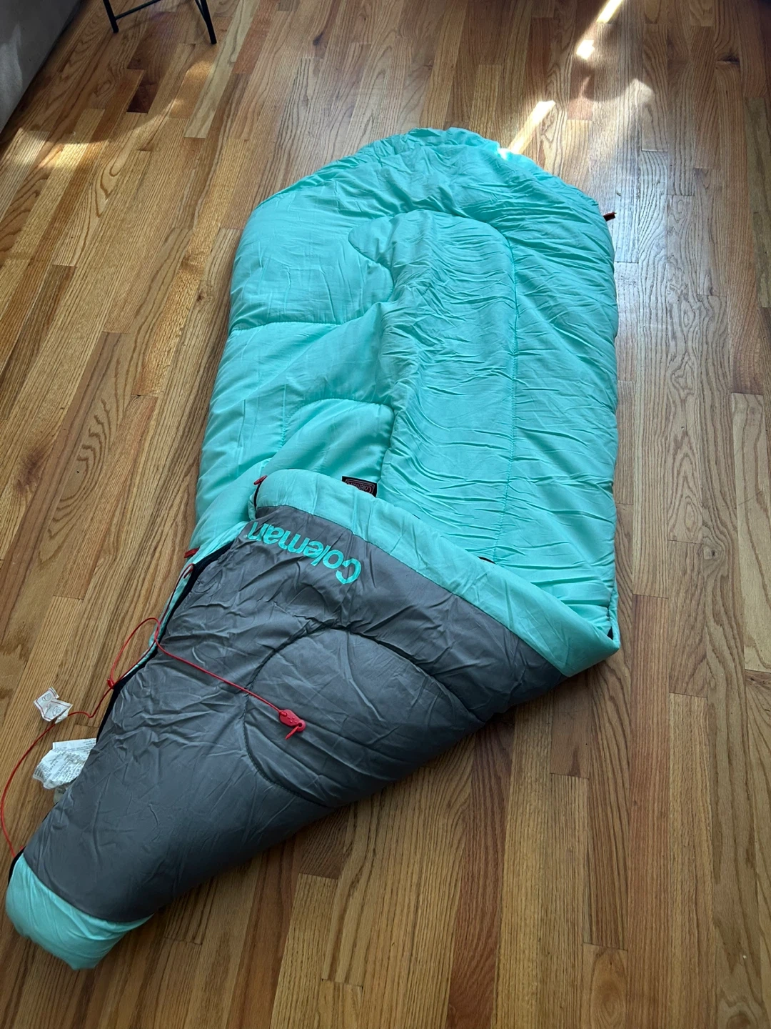 Selling a Coleman sleeping bag in aqua color! It's in great condition and perfect for camping or sleepovers. It rolls up easily for storage
