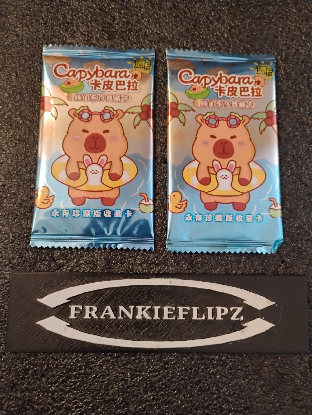 Selling two packs of Capybara collectible cards. Cute designs featuring a capybara with a bunny in a swimming ring! Perfect for collectors or anyone who loves capybaras