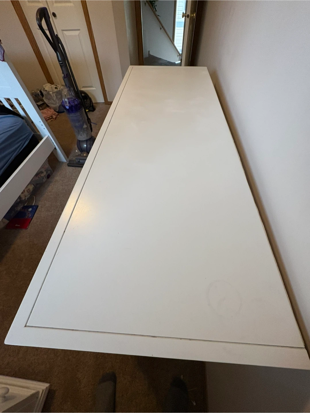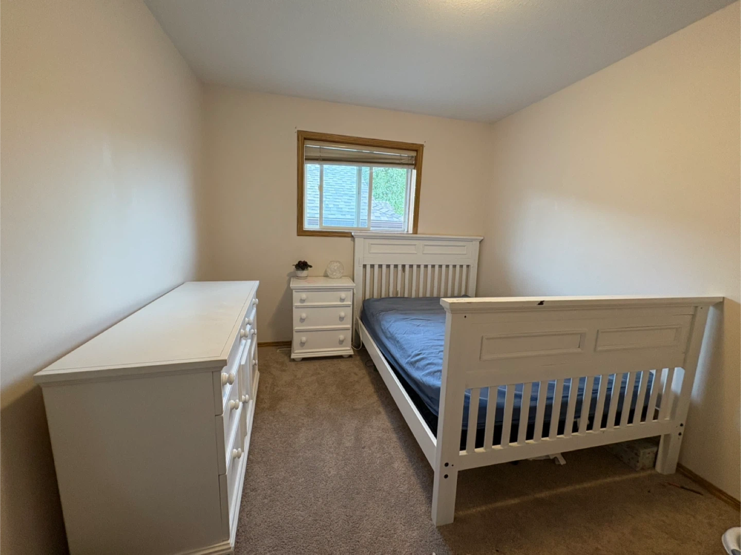 Selling a sturdy and spacious bed set, including a bed frame, nightstand, and dresser. Mattress is NOT included — frame only! The bed frame could use some reinforcement as the screw holes are slightly stripped. The nightstand has a small pink stain and there’s some normal wear on the paint, but overall the set is very solid — it just needs a little “lipstick” to shine!