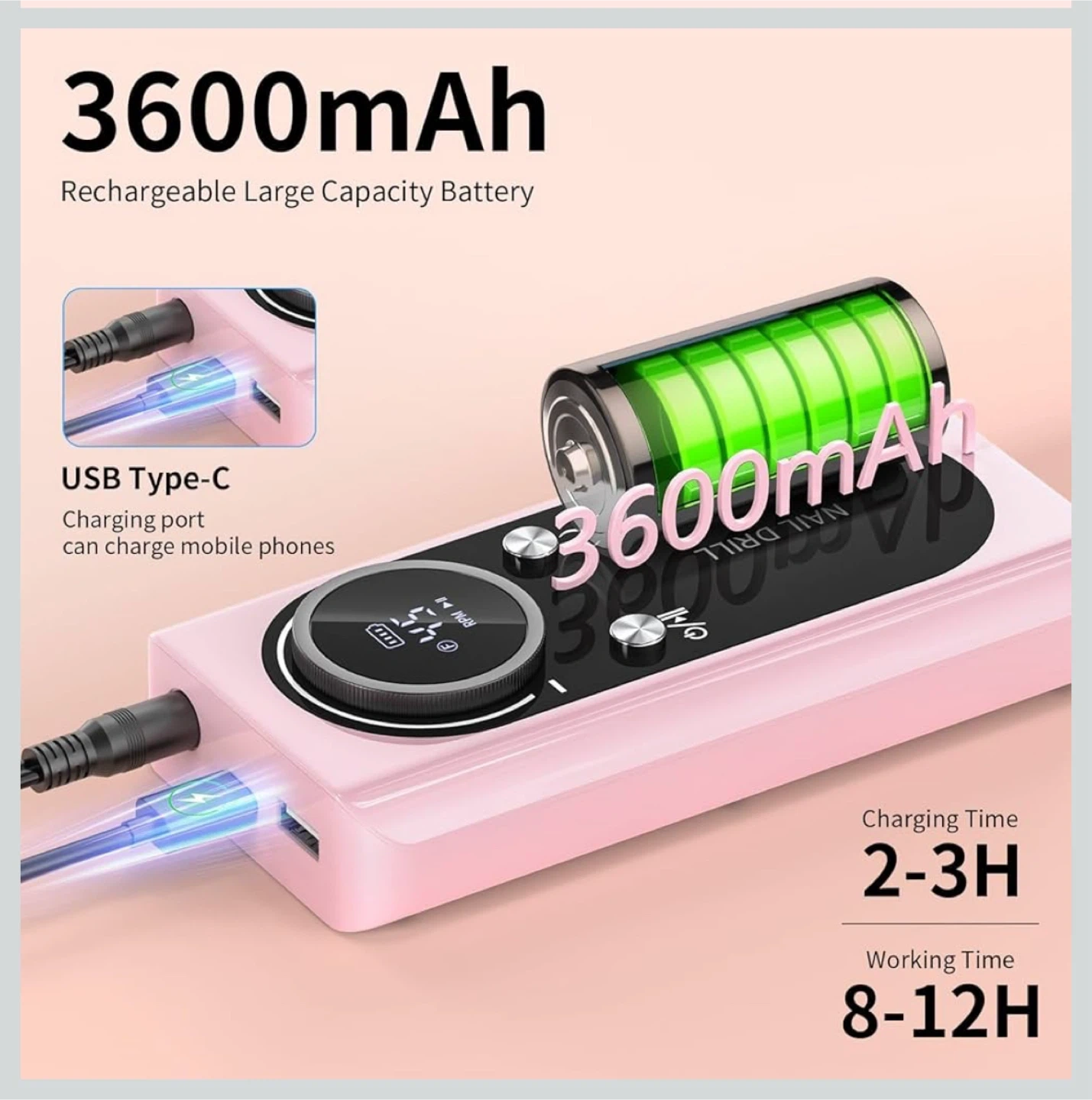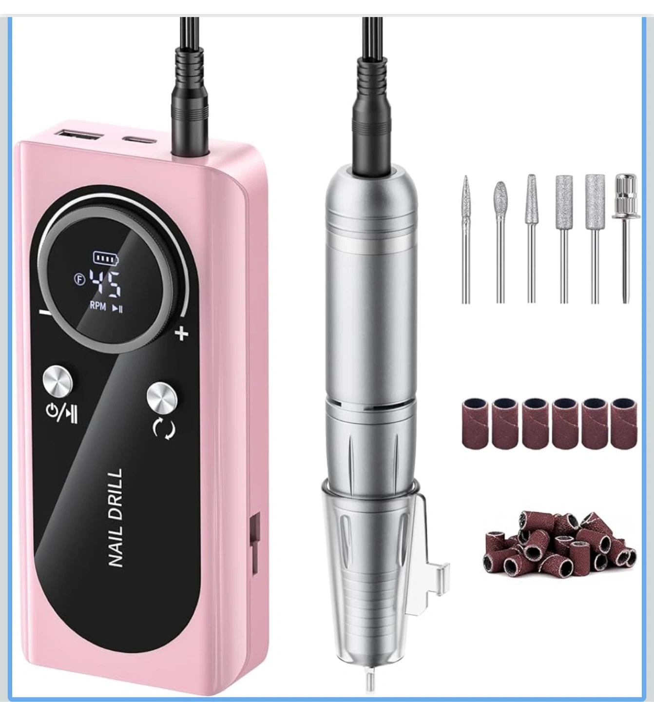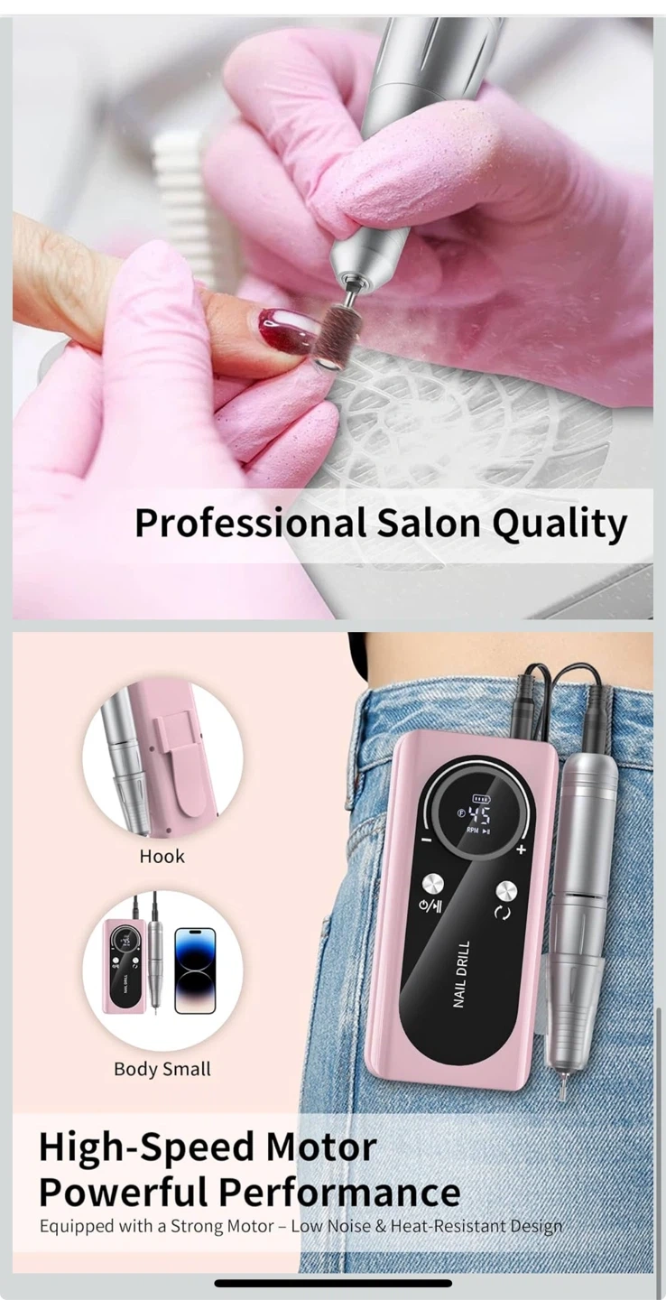 Electric Nail Drill Machine 45,000RPM - Professional Electric and Rechargeable Nail Drill with LCD Display, 6 Bits and 30 Sanding Bands, Low Heat Quiet E-File for Acrylic Gel Nails (Light Pink)