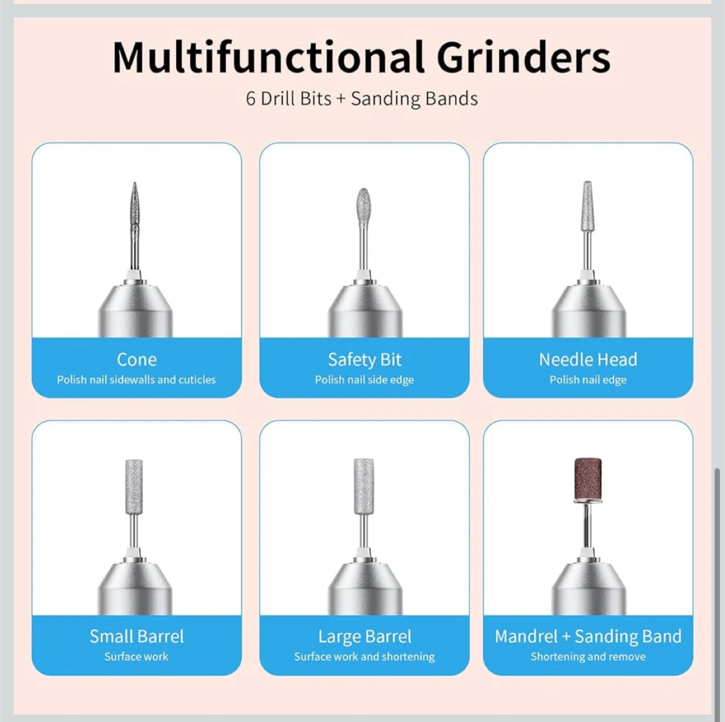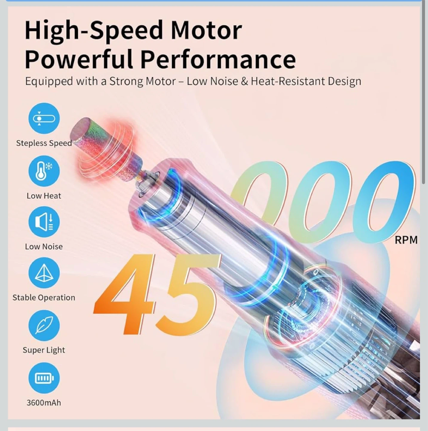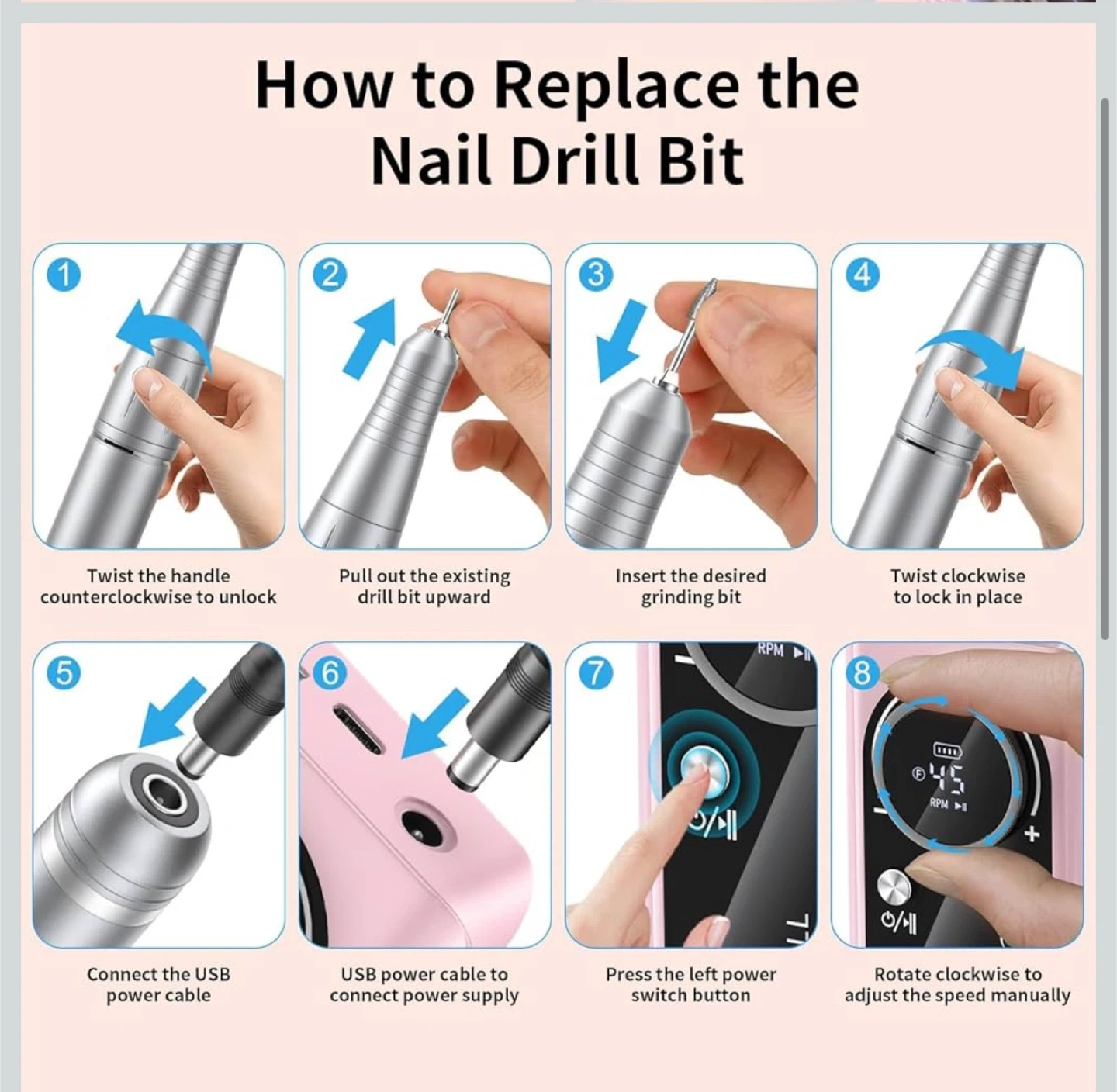 Electric Nail Drill Machine 45,000RPM - Professional Electric and Rechargeable Nail Drill with LCD Display, 6 Bits and 30 Sanding Bands, Low Heat Quiet E-File for Acrylic Gel Nails (Light Pink)