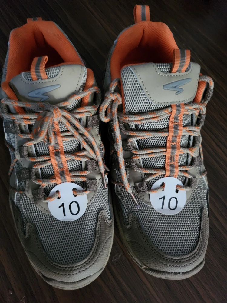 Selling a pair of Nevados hiking shoes in size 10. They're in good condition and ready for your next outdoor adventure! The shoes are a neutral colour with orange accents.