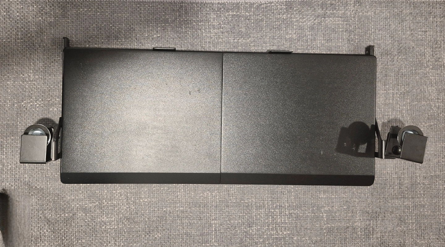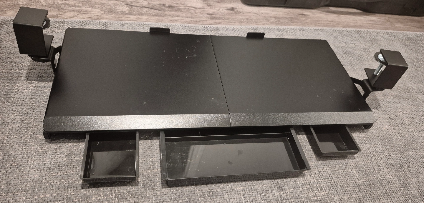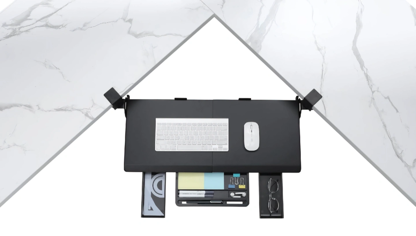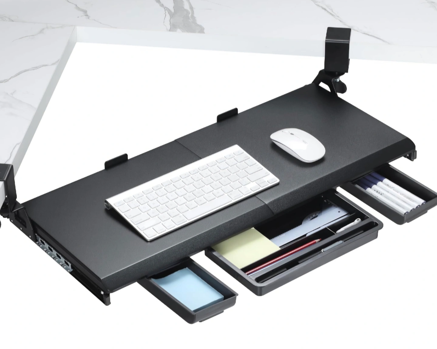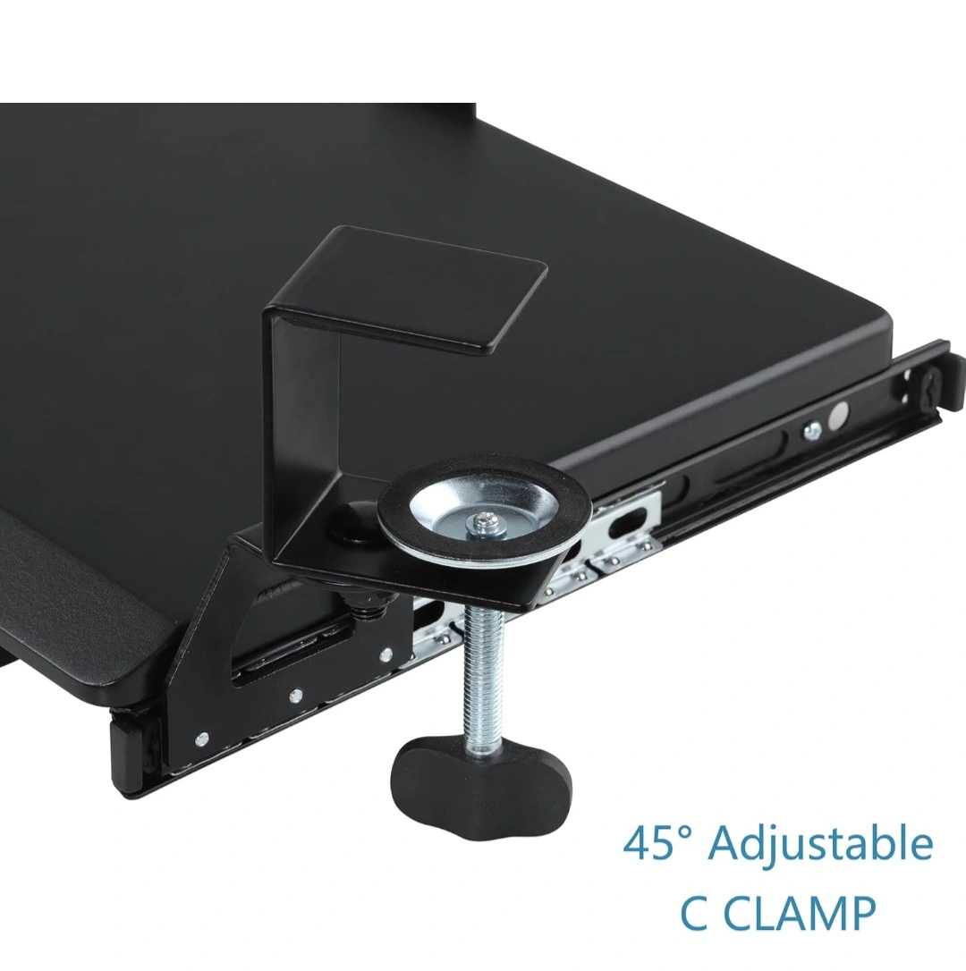 Declutter your workspace with this handy under-desk keyboard tray! It features smooth sliders for easy pull-out and push-in, and convenient storage drawers to keep your desk essentials organized. The C-clamp design makes allows for corner desk.