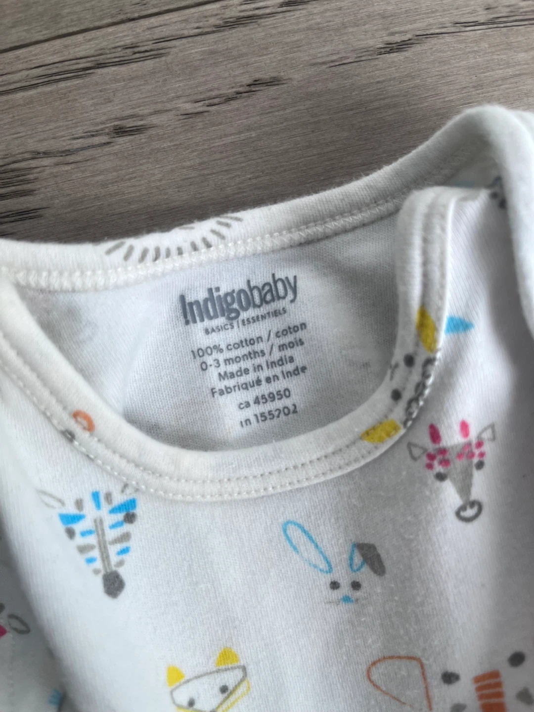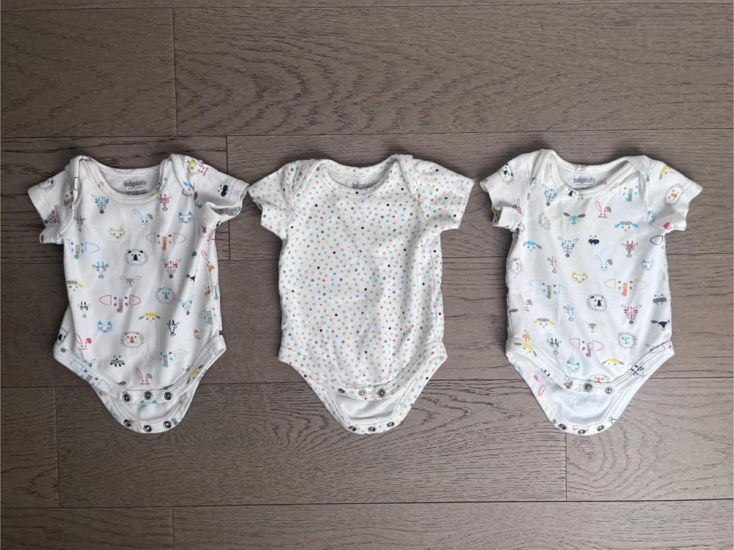 Selling a set of three adorable Indigo Baby onesies! They are size 0-3 months and made from 100% cotton. Two of them have a cute animal print, and the other has a colourful polka dot pattern. Perfect for your little one!