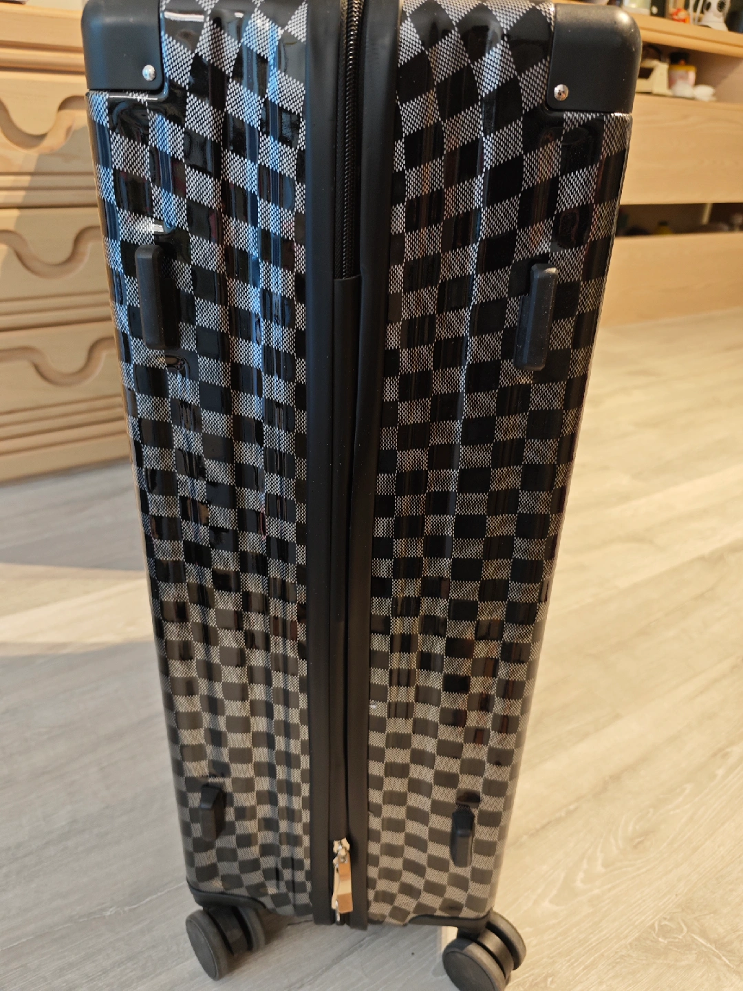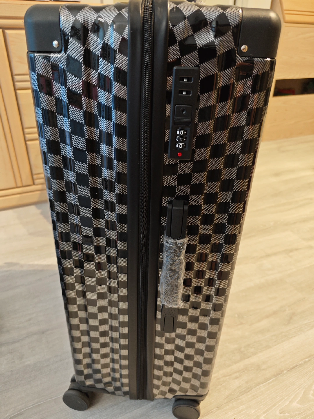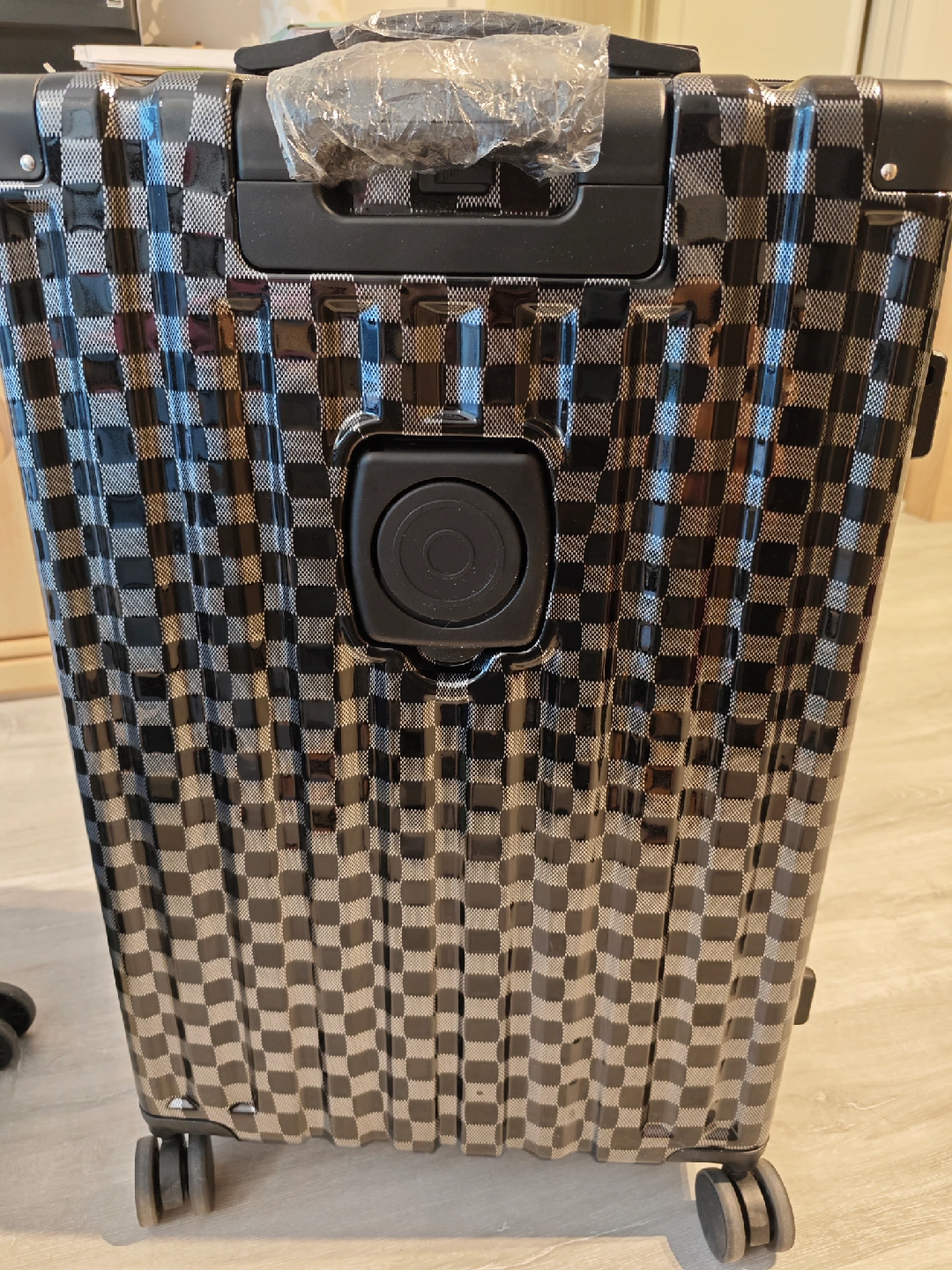 Selling checked luggage with checkered pattern. It has built-in cup holder and hangers for carrying small items. Used once with suitcase cover.