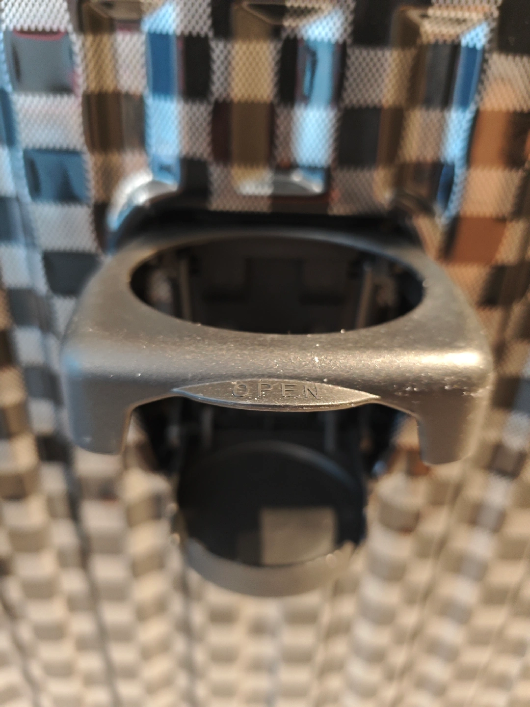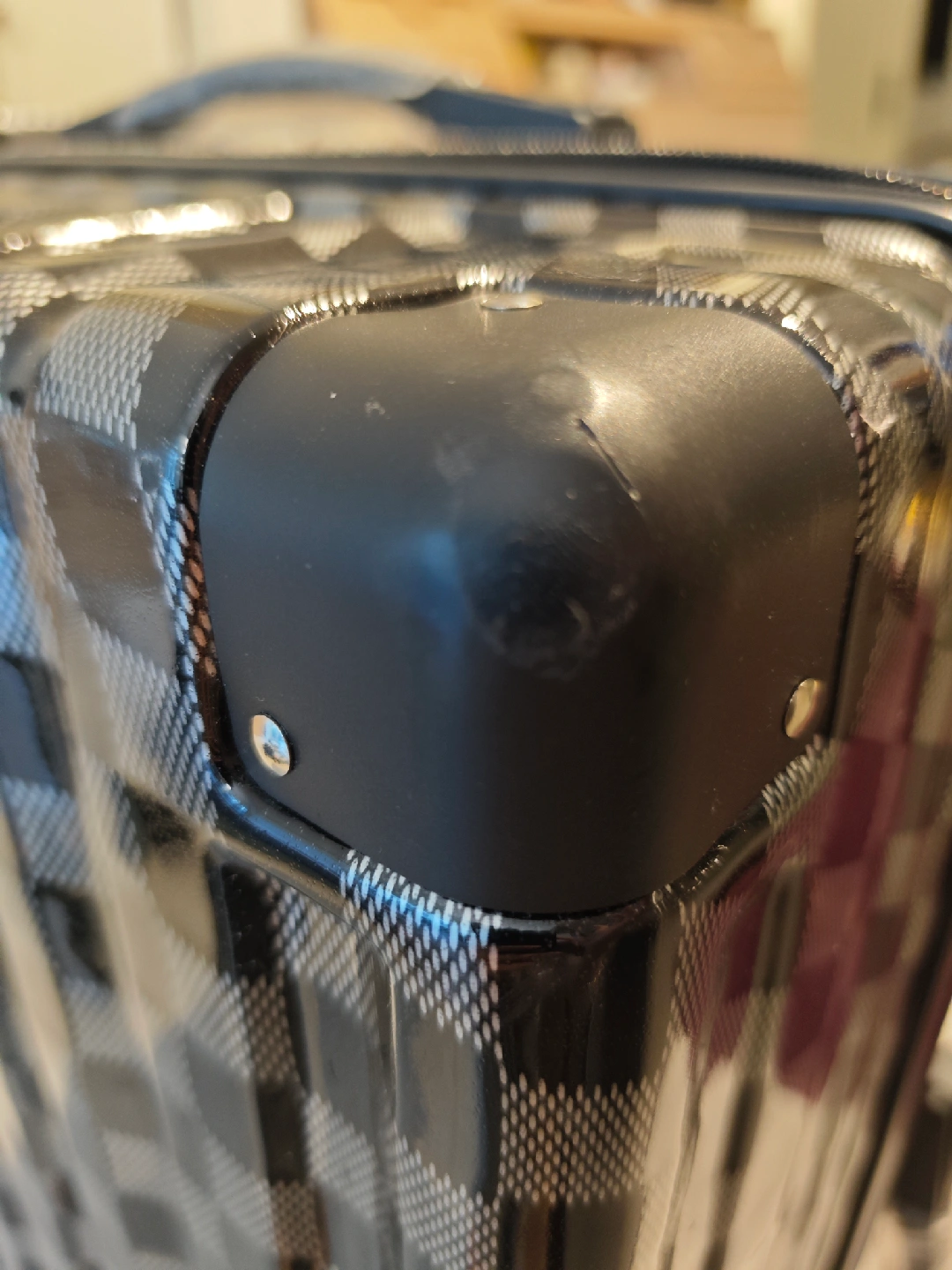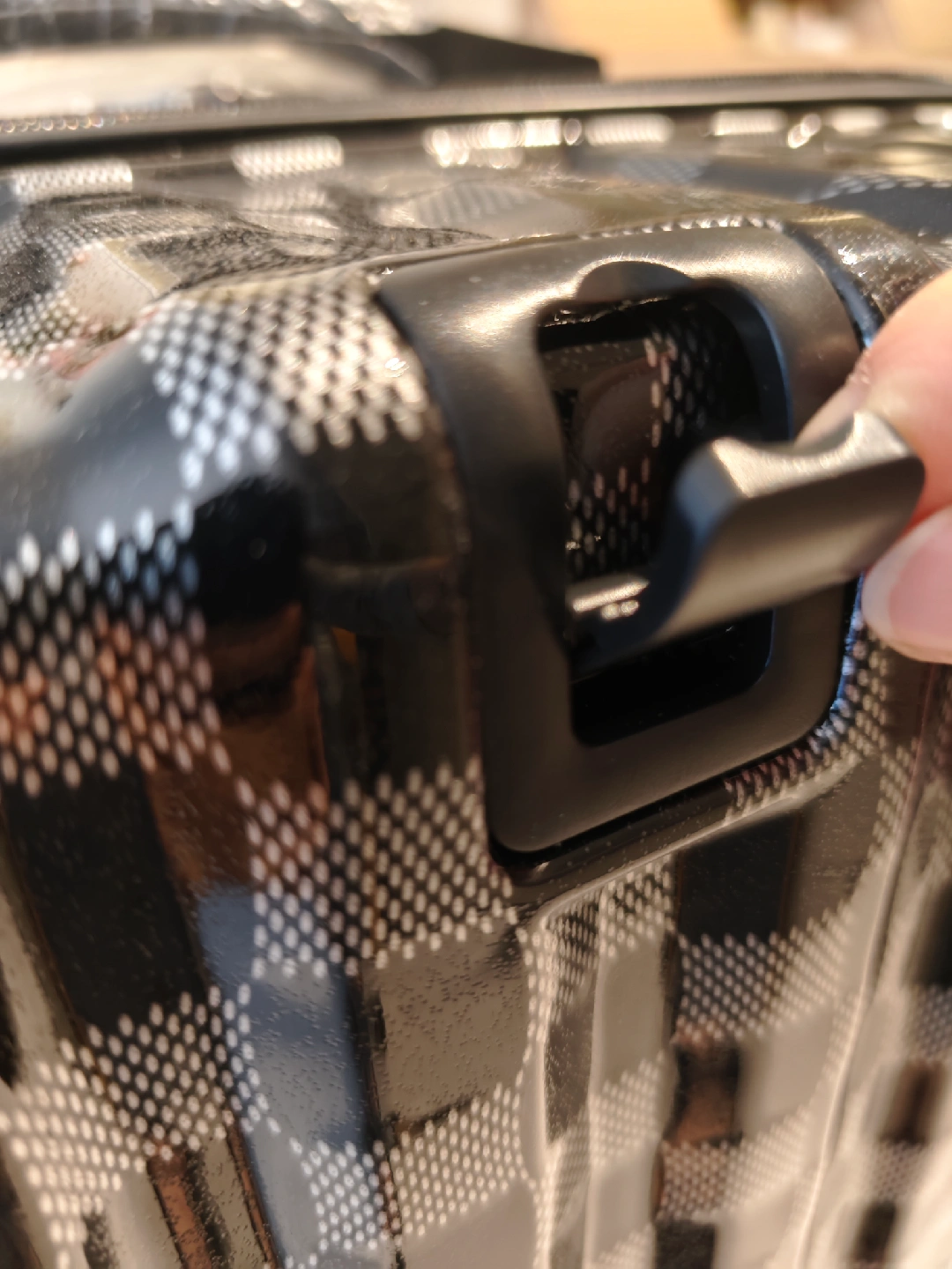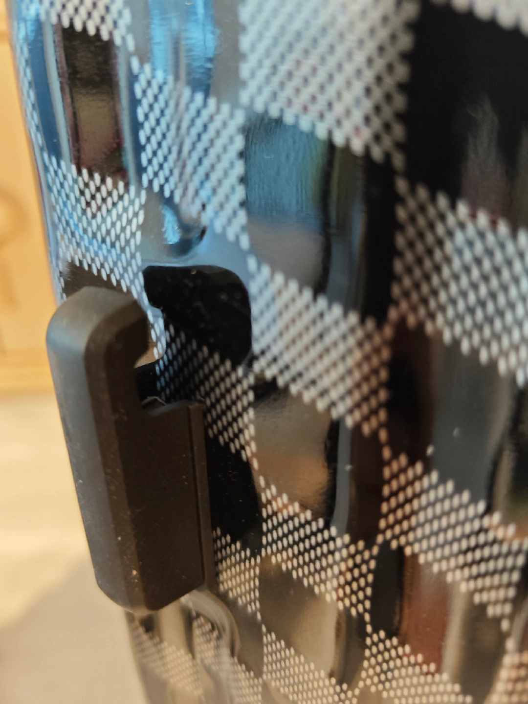 Selling checked luggage with checkered pattern. It has built-in cup holder and hangers for carrying small items. Used once with suitcase cover.