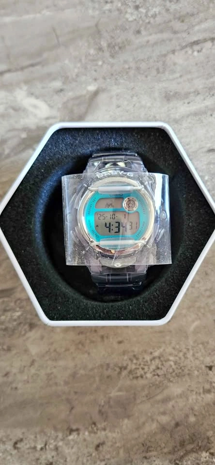 Classic clear resin strap with aqua blue dial (rare colorway).