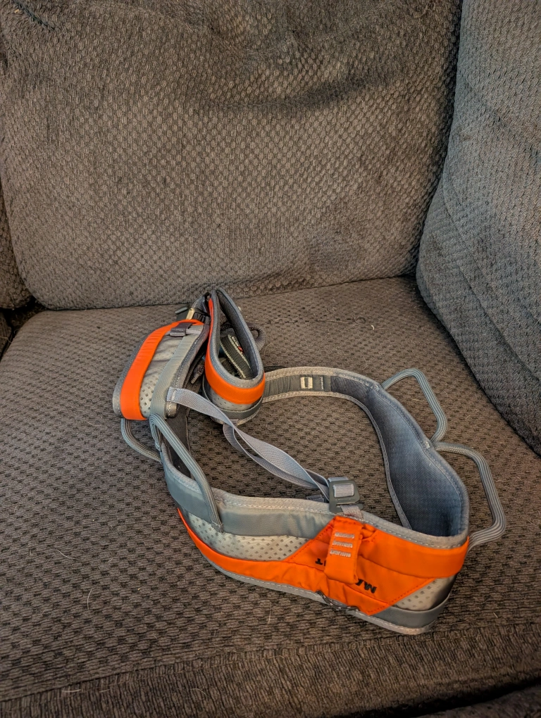 Selling a Mammut climbing harness in grey and orange. Only used a couple times indoors. Estimated wait size fits 32 to 34 inch..