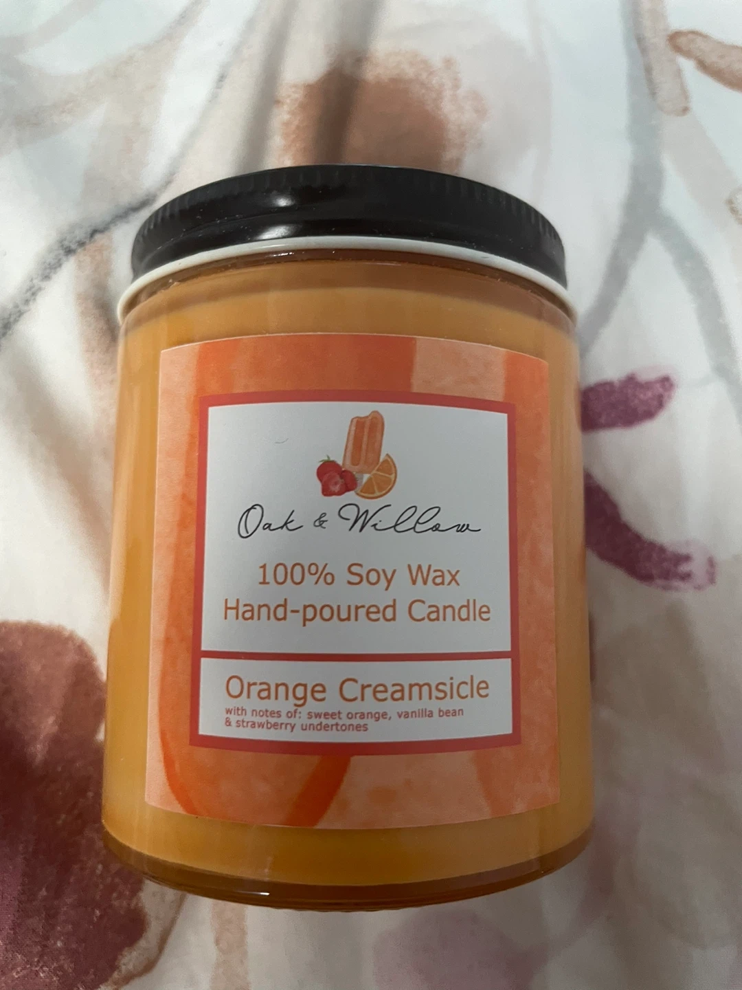 Selling a hand-poured candle from Oak & Willow! It's a 100% soy wax candle with an orange creamsicle scent. It has notes of sweet orange, vanilla bean, and strawberry undertones