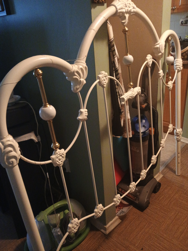 giving a lovely white, antique-style metal bed frame. It features a charming design with floral accents and gold-tone details. Perfect for adding a touch of vintage elegance to any bedroom!