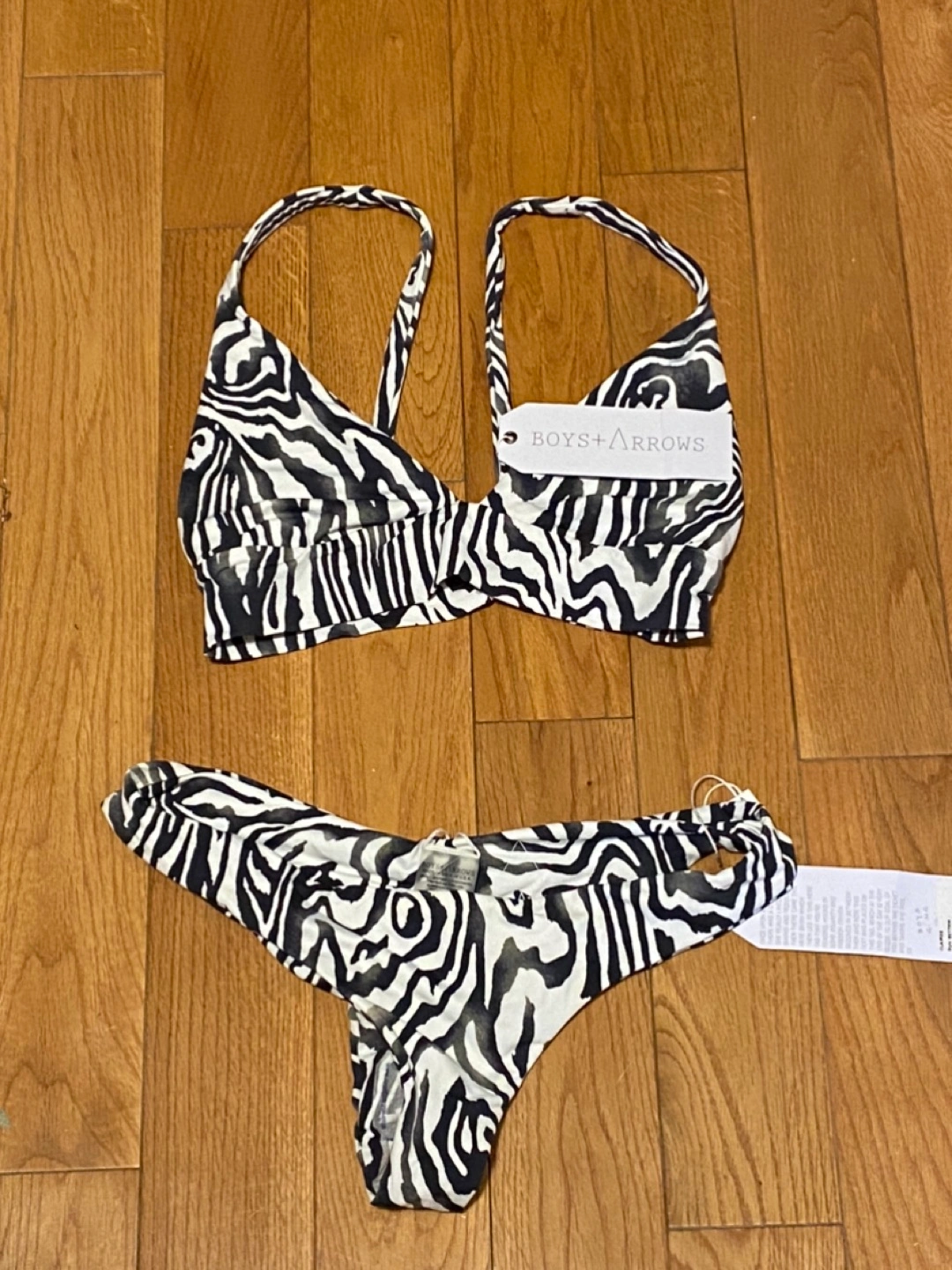 Bought pre-pregnancy and so my loss your gain. Beautiful fabric and Brazilian cut bottoms. Very flattering.