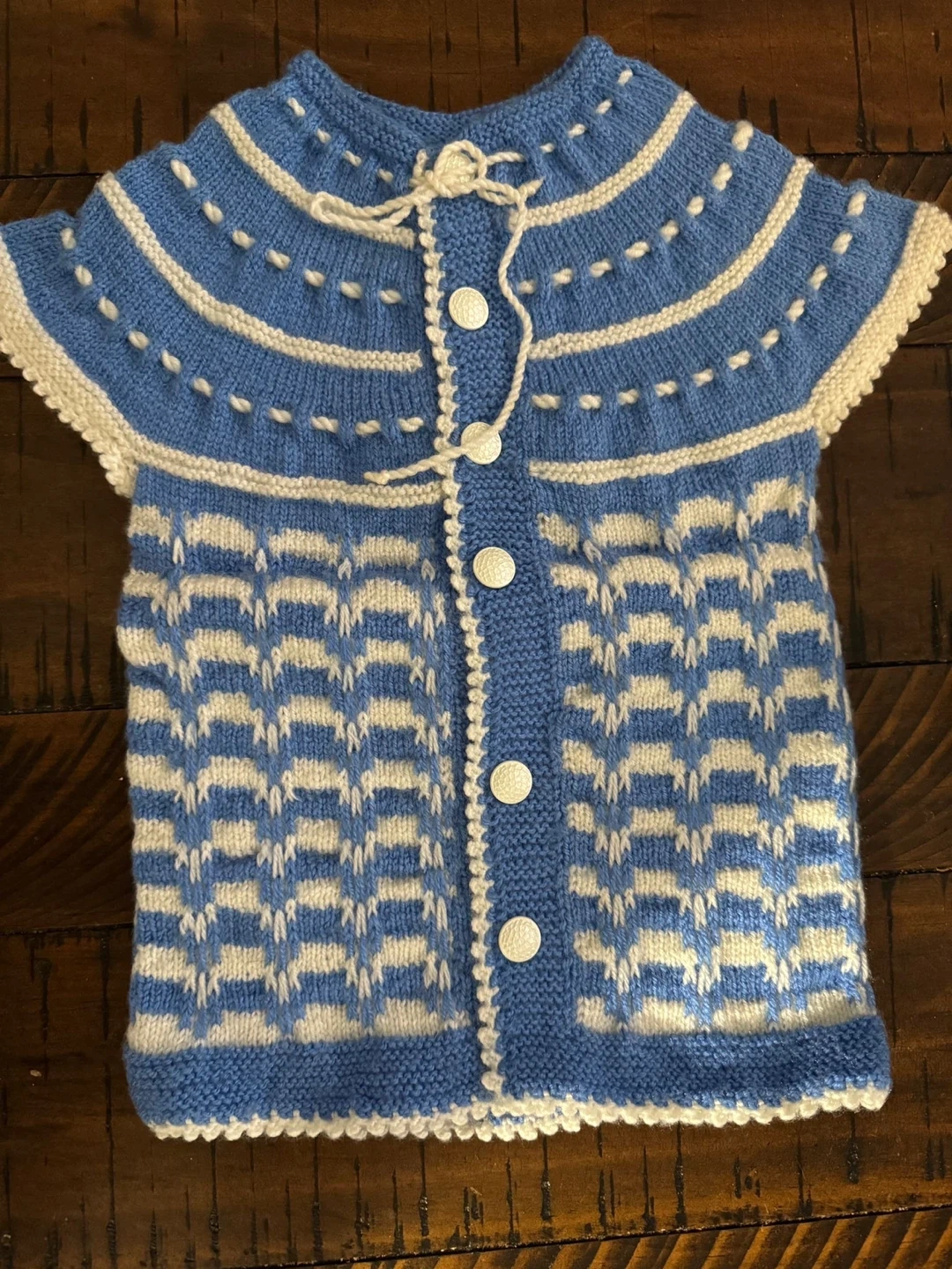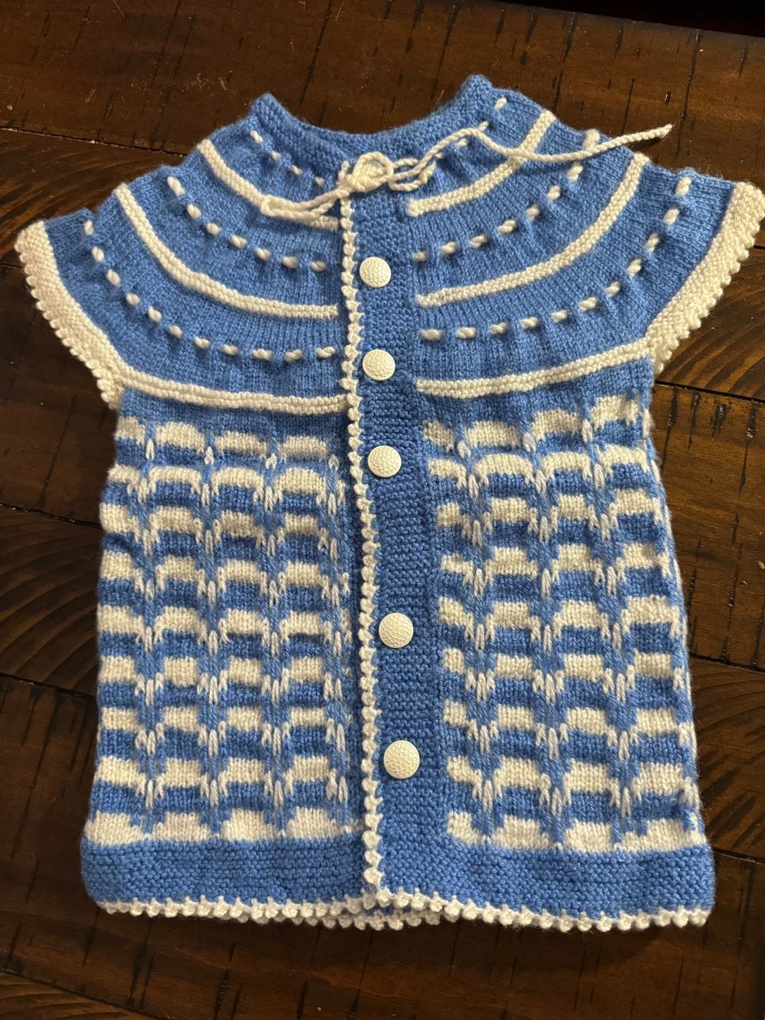 A sweet hand-knitted baby cardigan in a lovely blue and white pattern! Perfect for keeping your little one cozy and stylish. It features a button-up front and a charming design. Ideal for layering during cooler days! Fits 1-2 years old