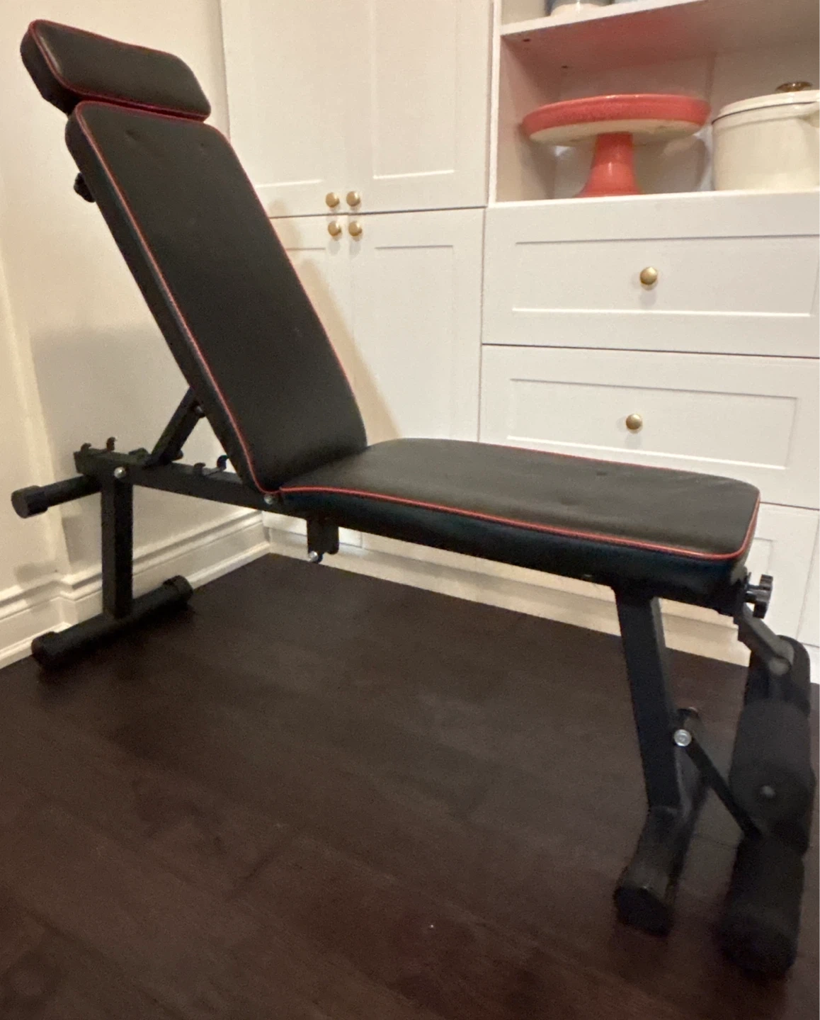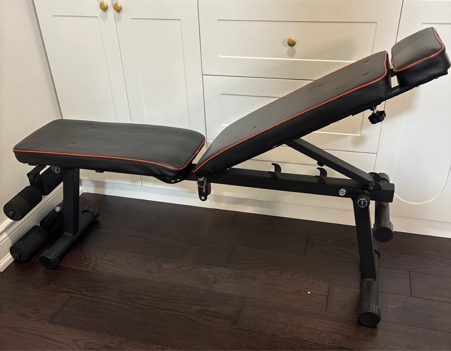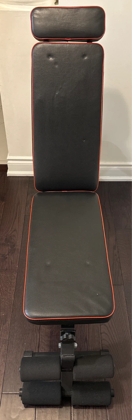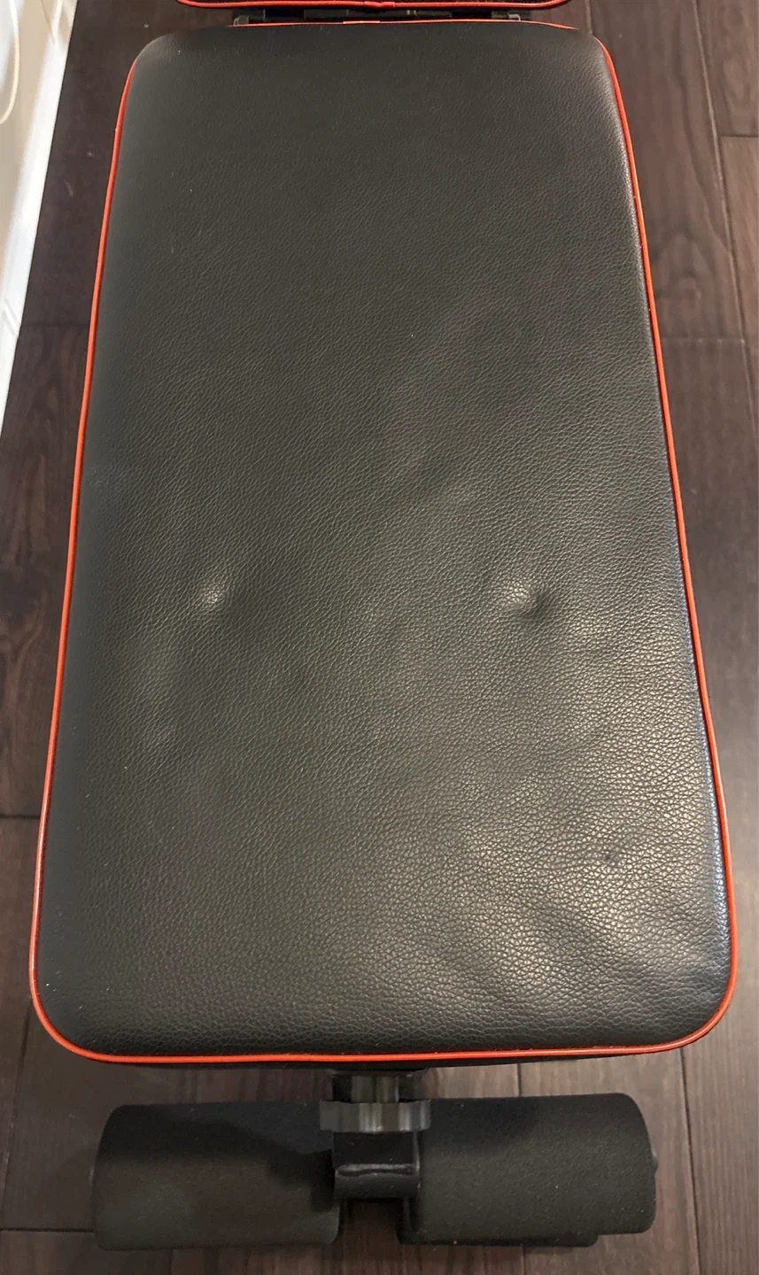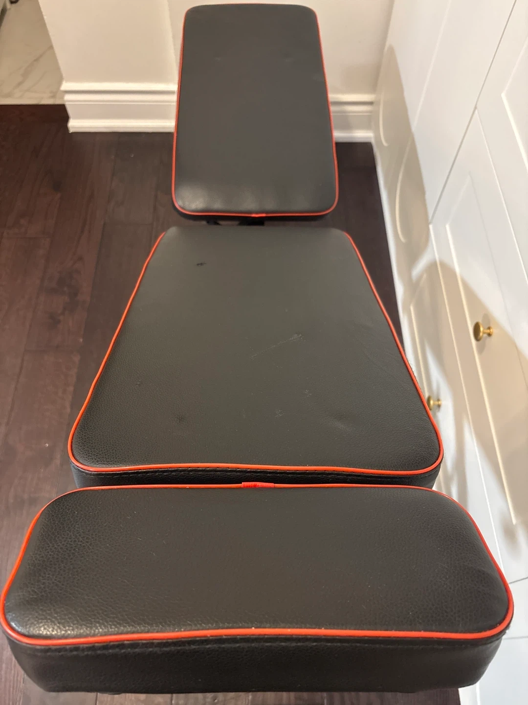 Selling an adjustable weight bench in good condition. It's black with a red trim. Great for home workouts and adjusting to different angles for various exercises. It has some signs of wear, but it's still fully functional and ready to help you reach your fitness goals!