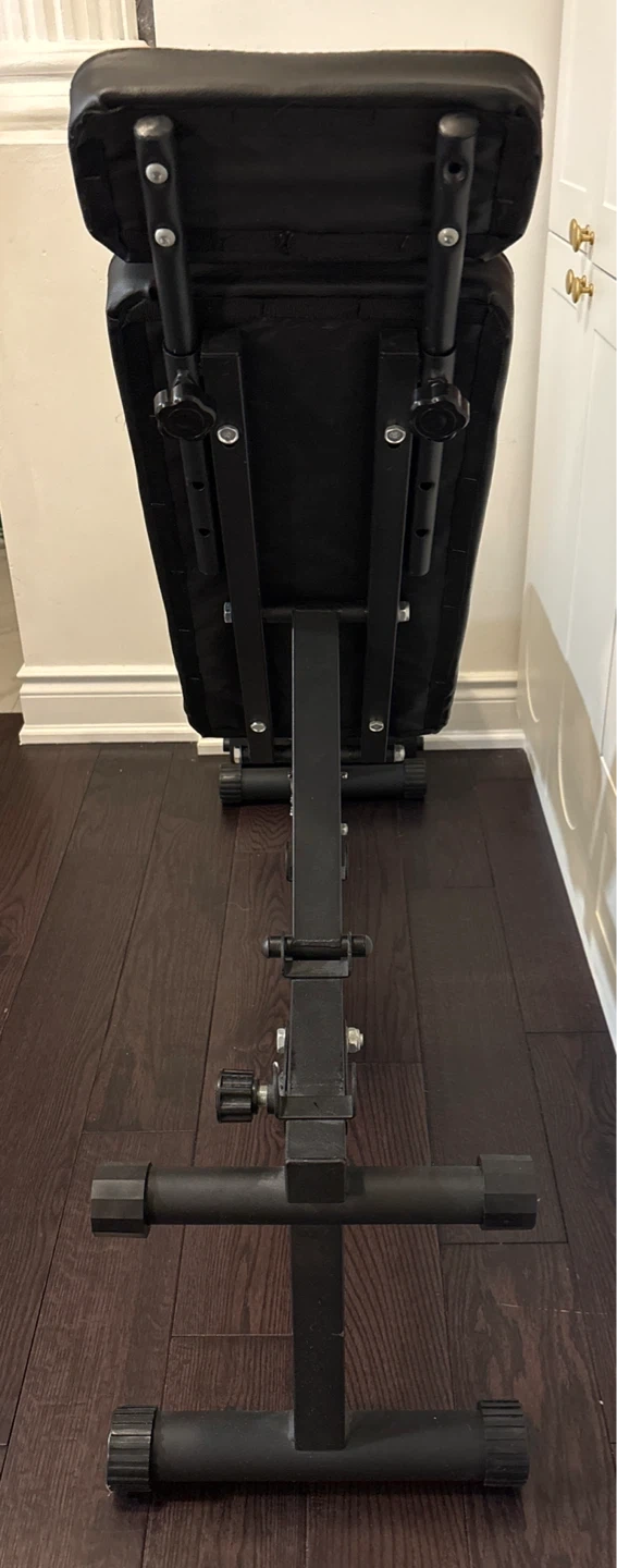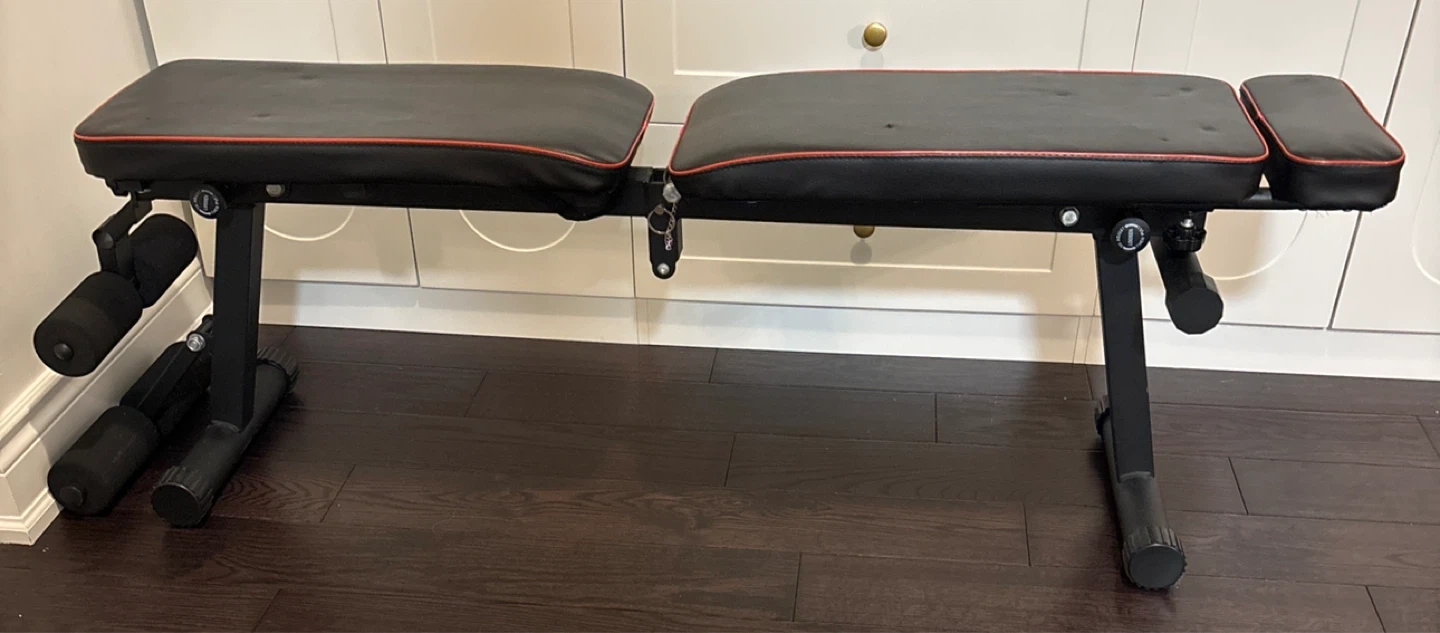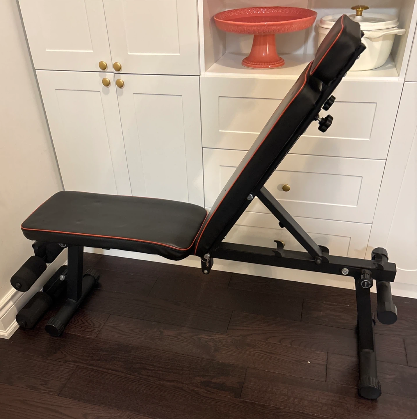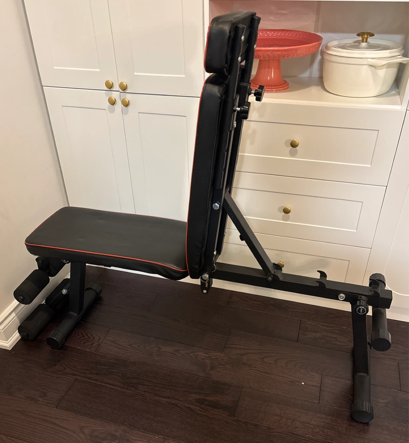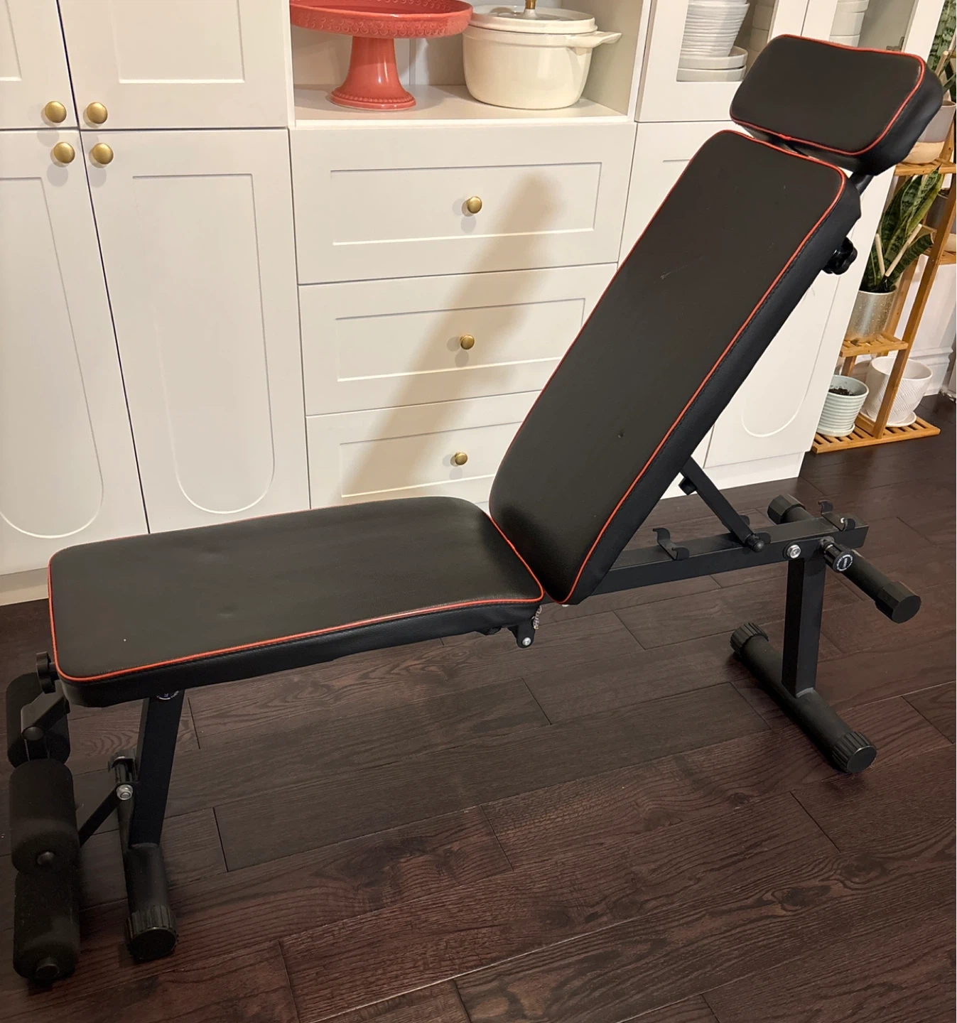 Selling an adjustable weight bench in good condition. It's black with a red trim. Great for home workouts and adjusting to different angles for various exercises. It has some signs of wear, but it's still fully functional and ready to help you reach your fitness goals!