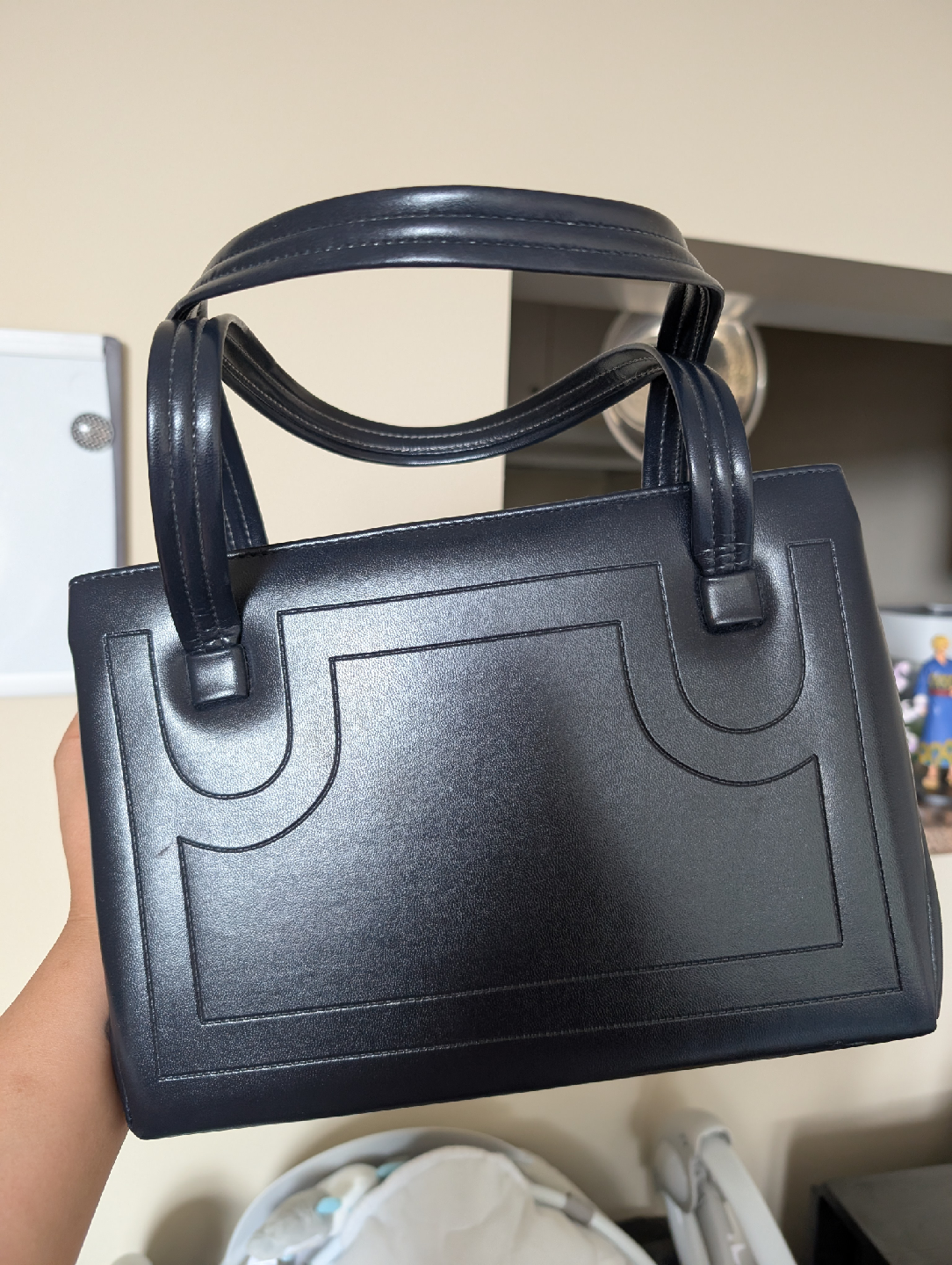 A stylish navy blue handbag with a structured design. It's in great condition and perfect for everyday use or a night out. The bag has a unique and elegant look. Feel free to ask any questions!