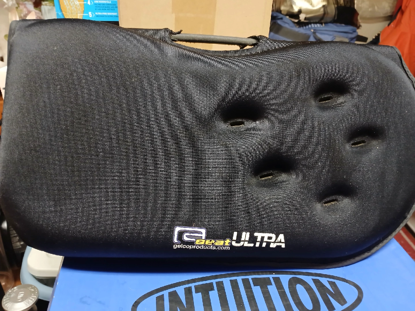 I'm selling a Gelco Seat Ultra seat cushion in black. It's designed for comfort and support, perfect for long periods of sitting. It has a unique design with multiple holes, likely for ventilation and pressure relief. 15 1/2x9. with carry handle. New retails for $99