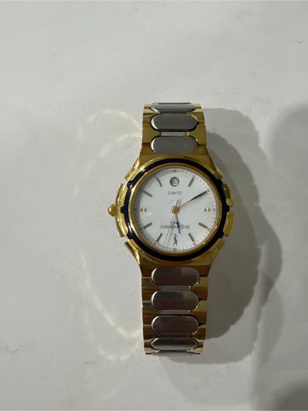 Selling a Yves Saint Laurent Quartz watch. It features a gold and silver band with a white face. The watch measures approximately 3.5 cm in diameter.