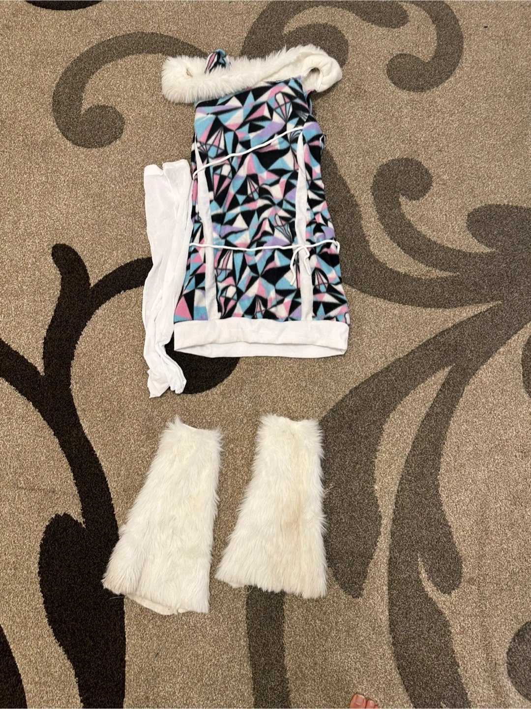 Selling a costume set with a unique geometric pattern. It includes the main dress piece, a pair of fluffy leg warmers, and white tights. Perfect for this Halloween
