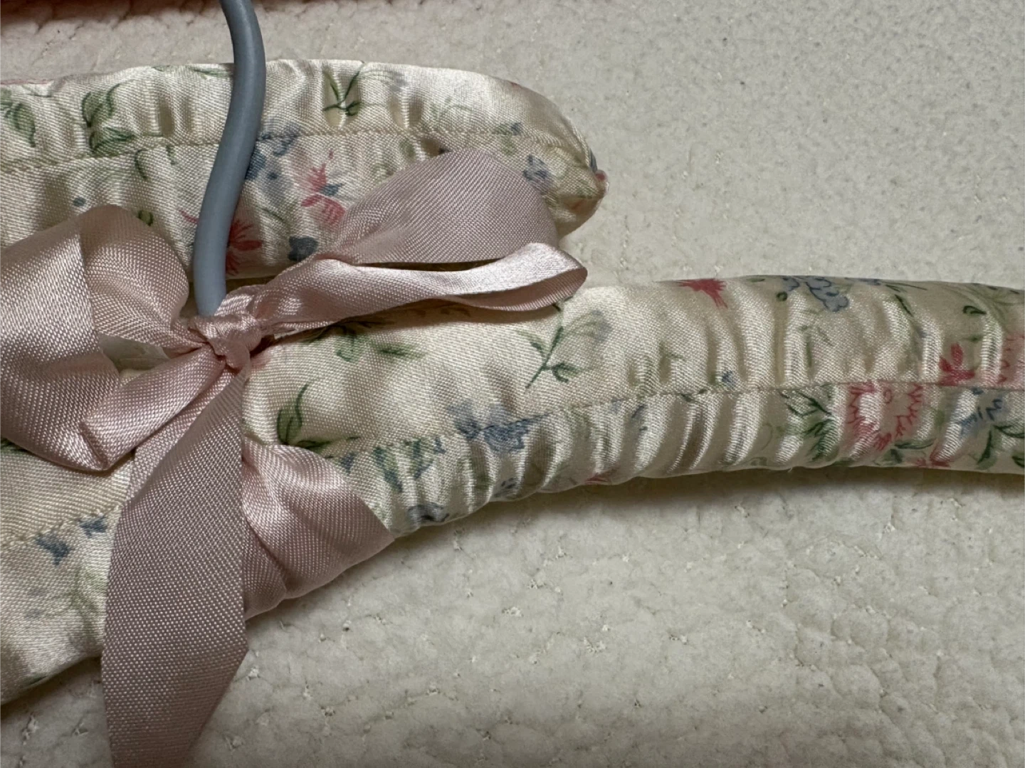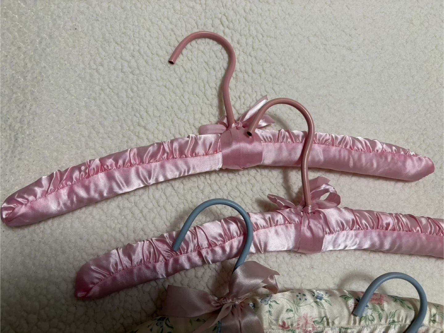 Add a touch of elegance to your closet with these satin padded hangers. This set of five hangers includes two in solid pink and three in a delicate floral pattern. These used hangers are not only functional but also add a decorative touch to your wardrobe.