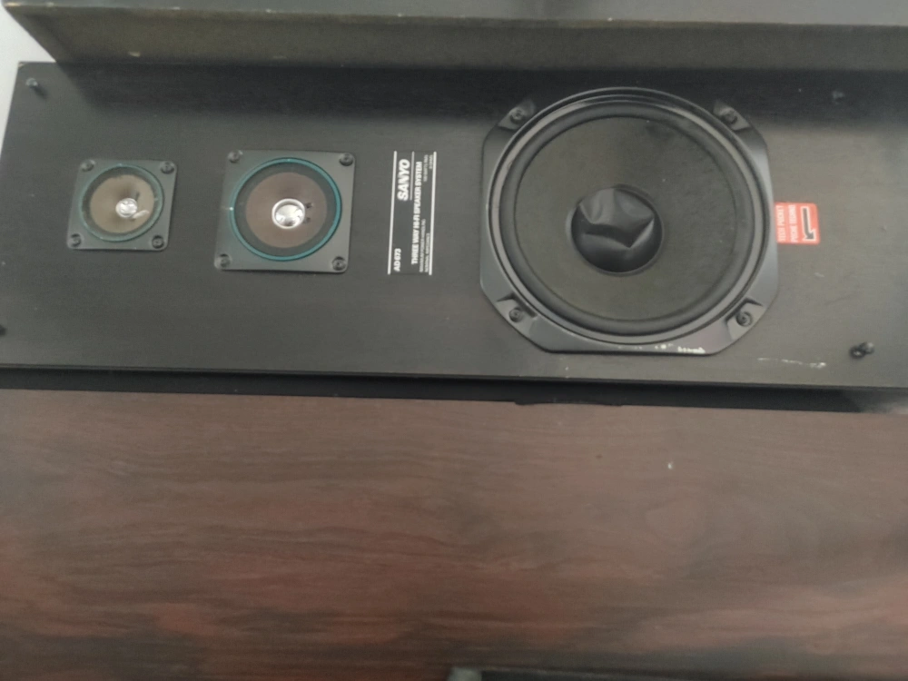 Selling a Sanyo AD 679 Three Way Hi-Fi Speaker System. It shows some signs of use, including some scratches on the exterior, but is still in good working condition. Perfect for someone looking for a vintage audio experience!