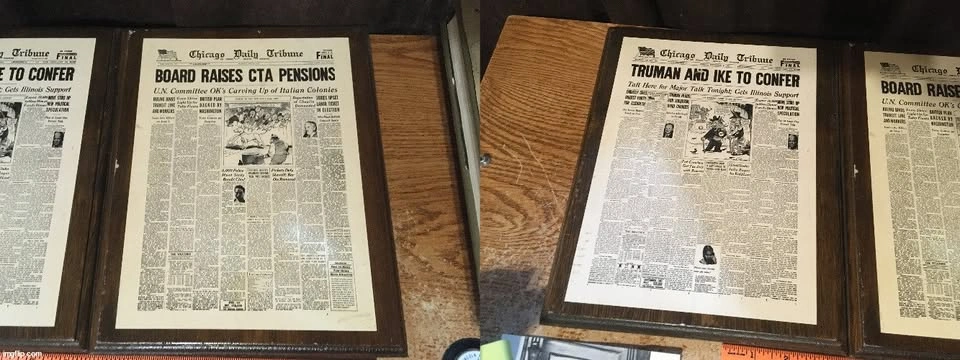 2x Chicago Daily Tribune front page wood plaques (1949, 1951). Good condition, has some scuffs mostly on the back and a few bumps on the front.