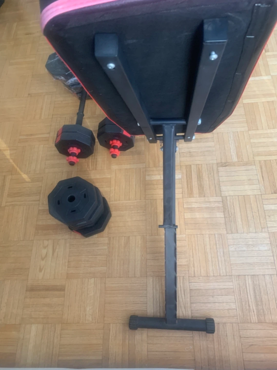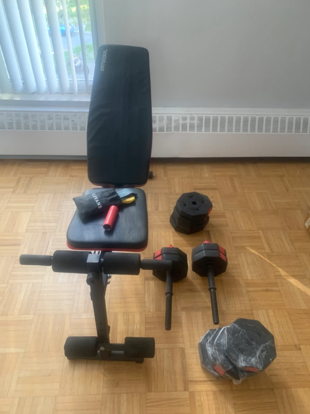 Selling an ORTEESOL weight bench in great condition. It comes with dumbbells and resistance bands. Perfect for setting up your home gym!