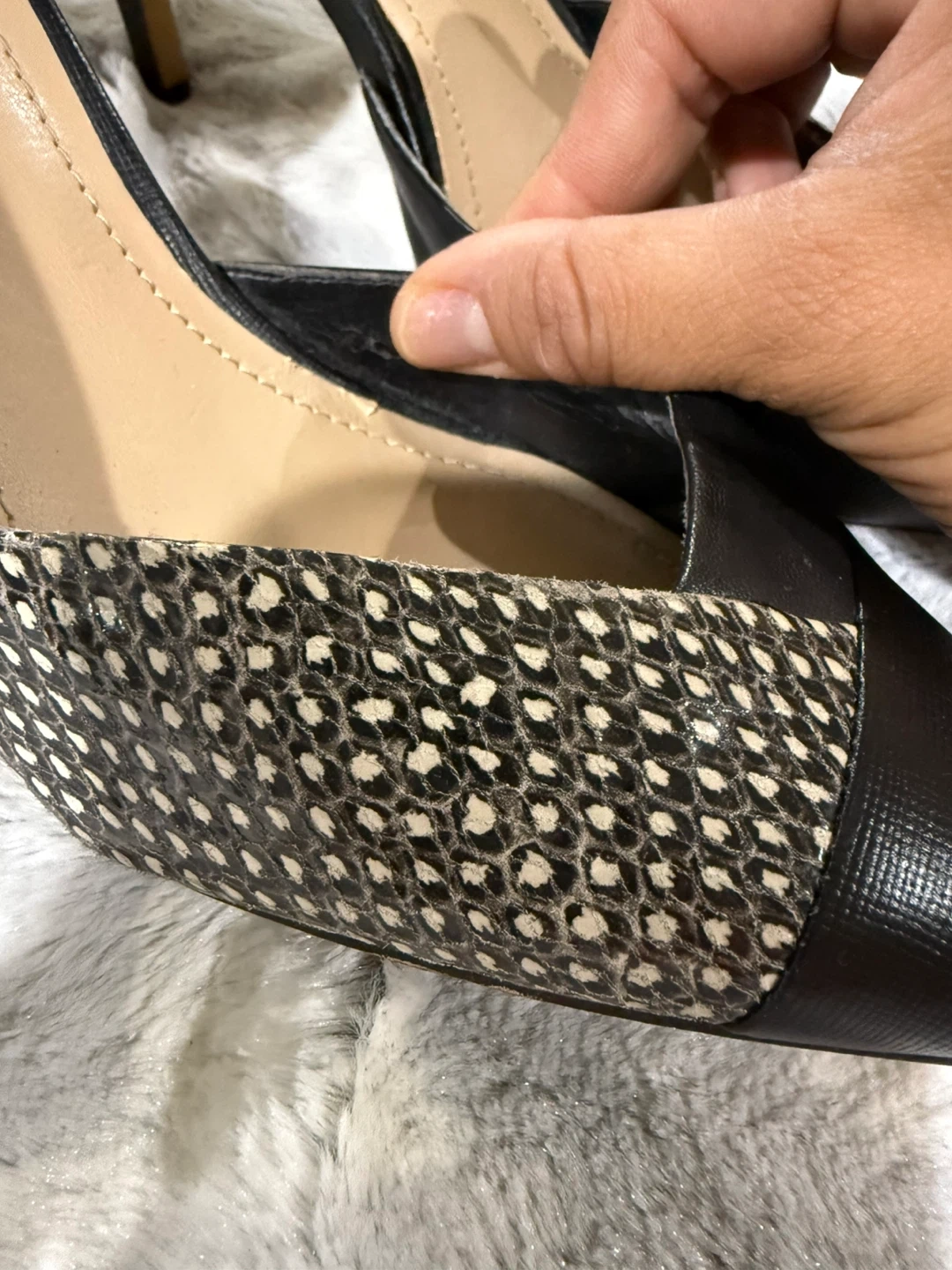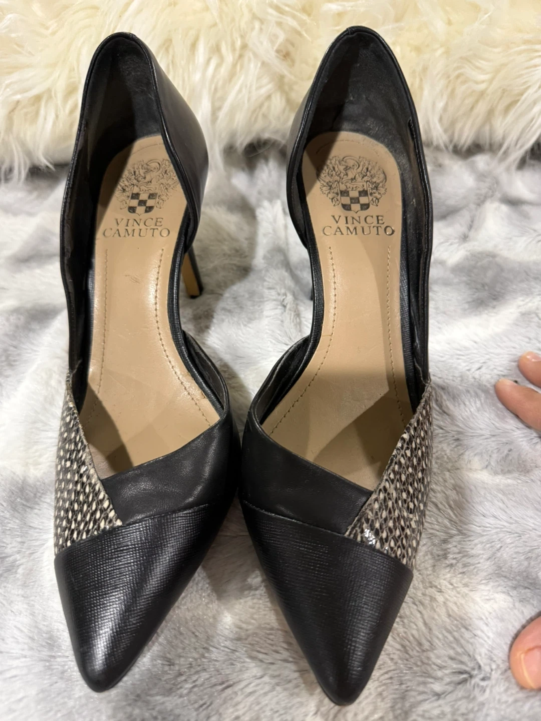 Selling a pair of Vince Camuto heels in black. They show some signs of wear, particularly on the heels, as shown in the pictures. Still a stylish pair of shoes!