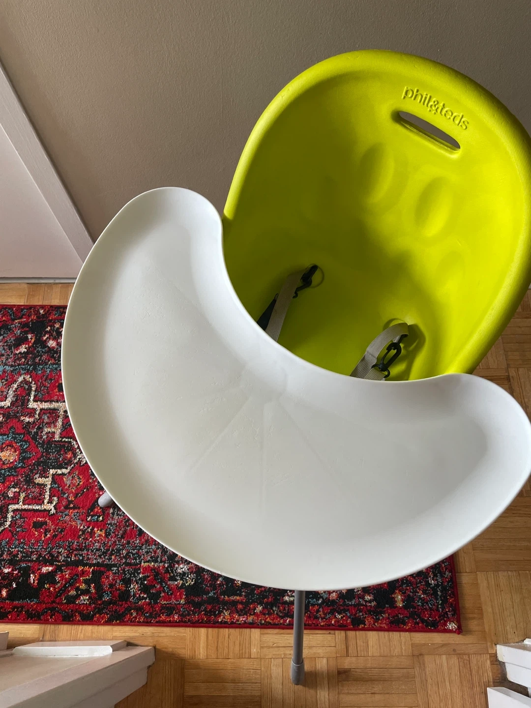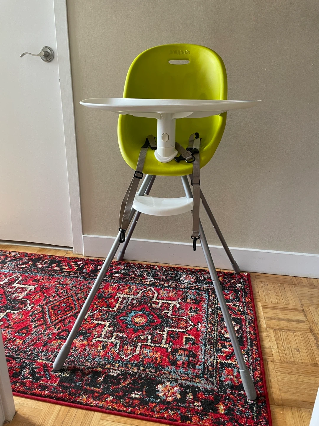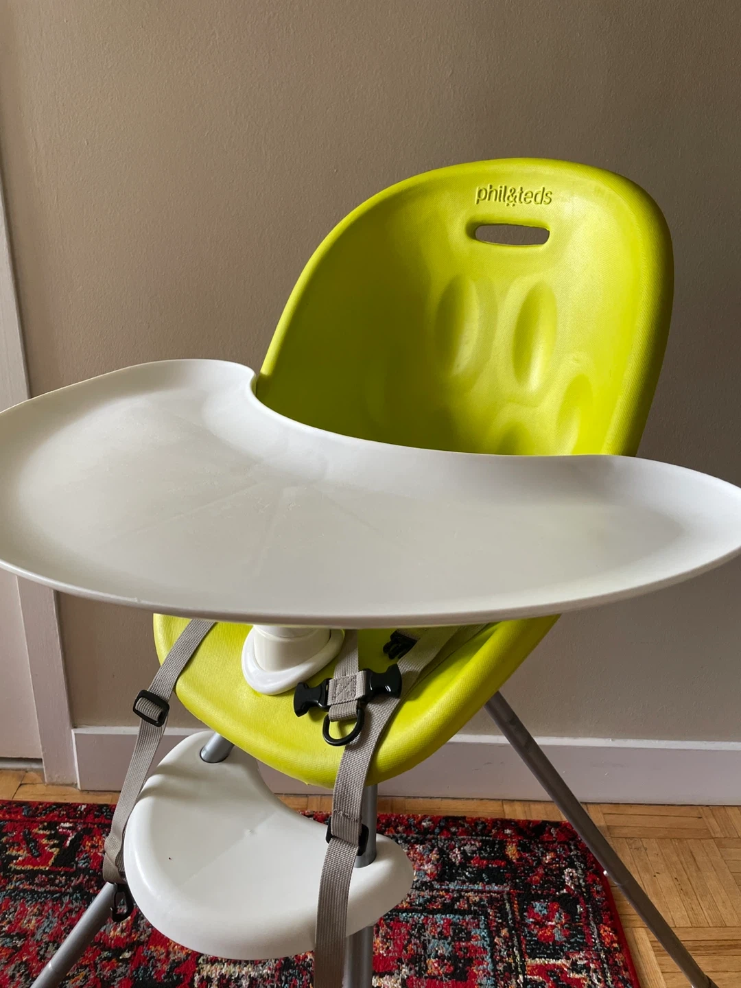 Selling used Phil & Ted’s High Chair. In good condition and has been thoroughly cleaned. Great for 6months+. Adjustable safety straps, easily remove table top eating surface for cleaning. Entire thing is washable.
